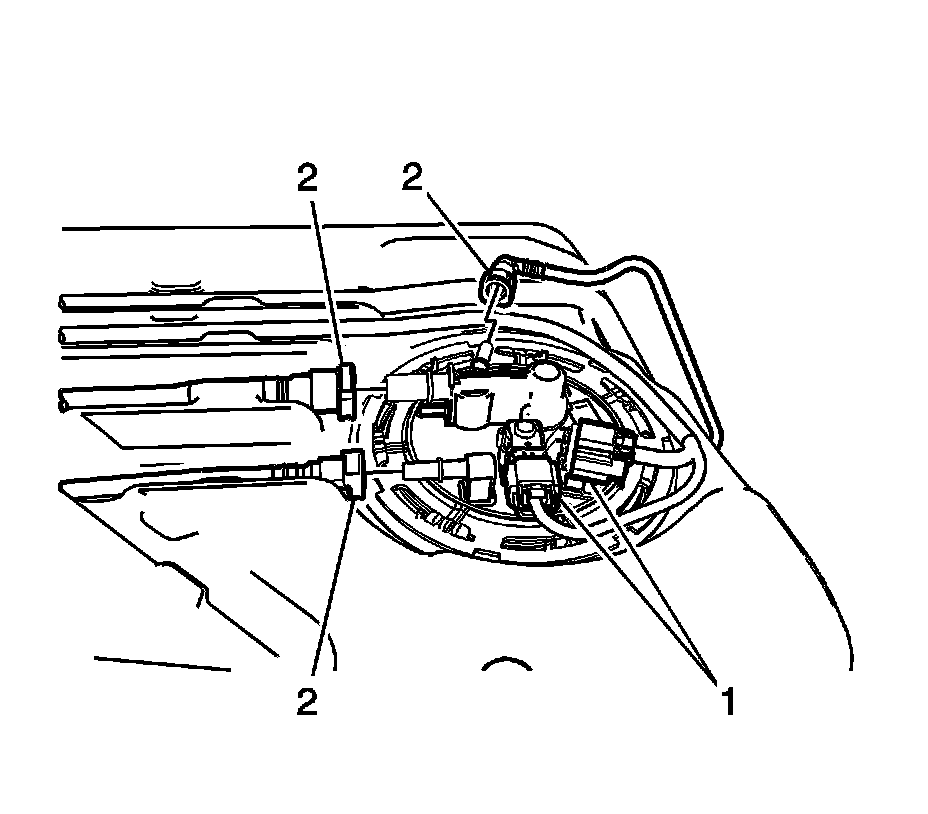 3. Disconnect the fuel and evaporative emission lines (2). Refer to Plastic Collar Quick Connect Fitting Service (Plastic Collar Quick Connect Fitting Service).