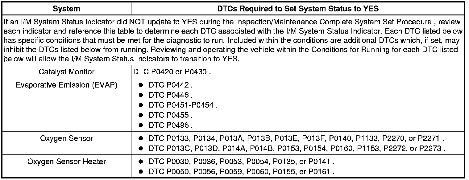 Inspection/Maintenance (I/M) Test DTC Table