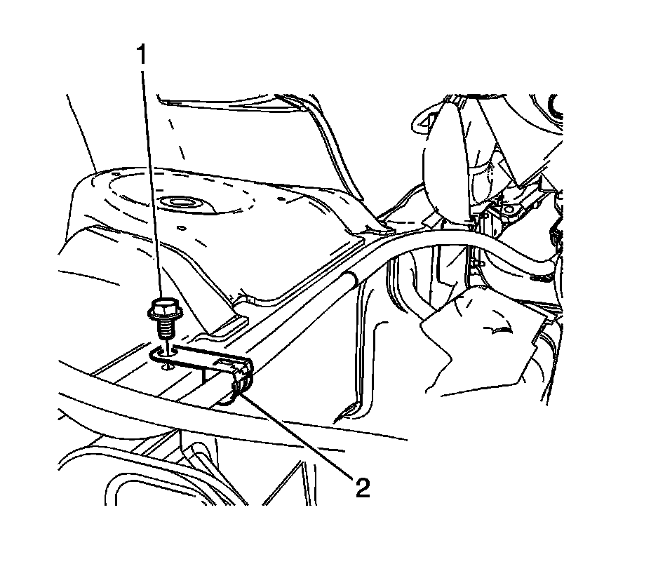 7. Remove the positive battery cable retainer (2) to frame bolt (1).