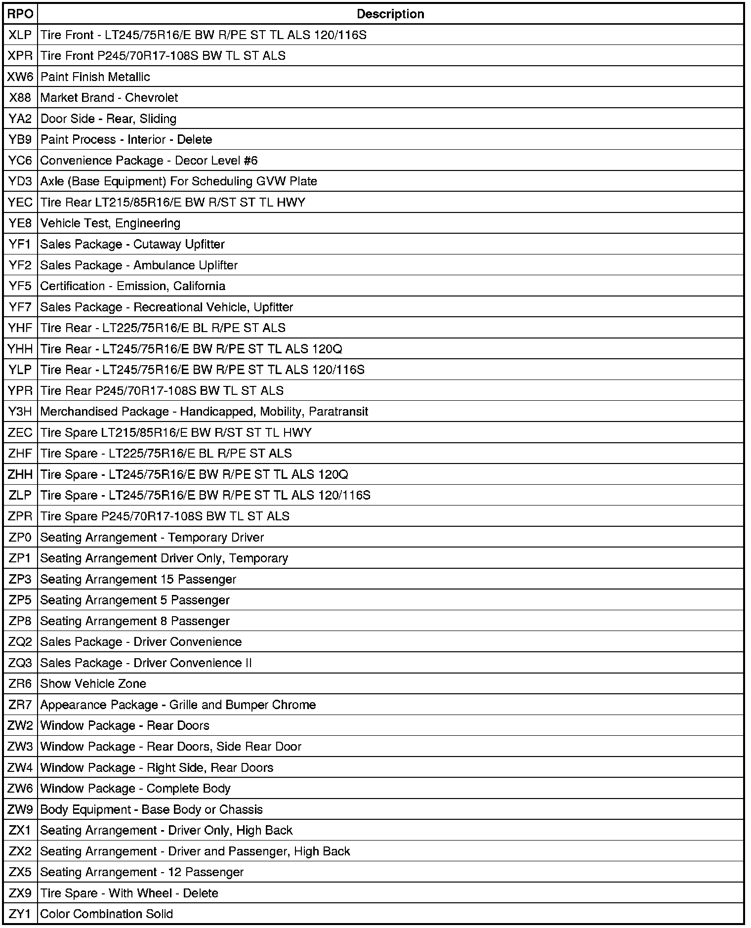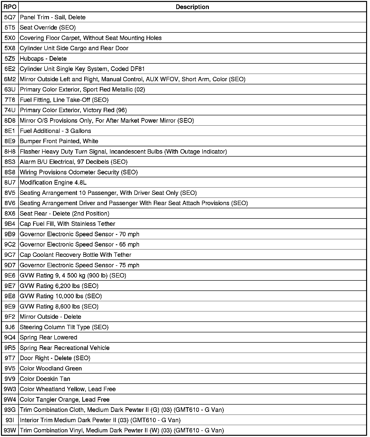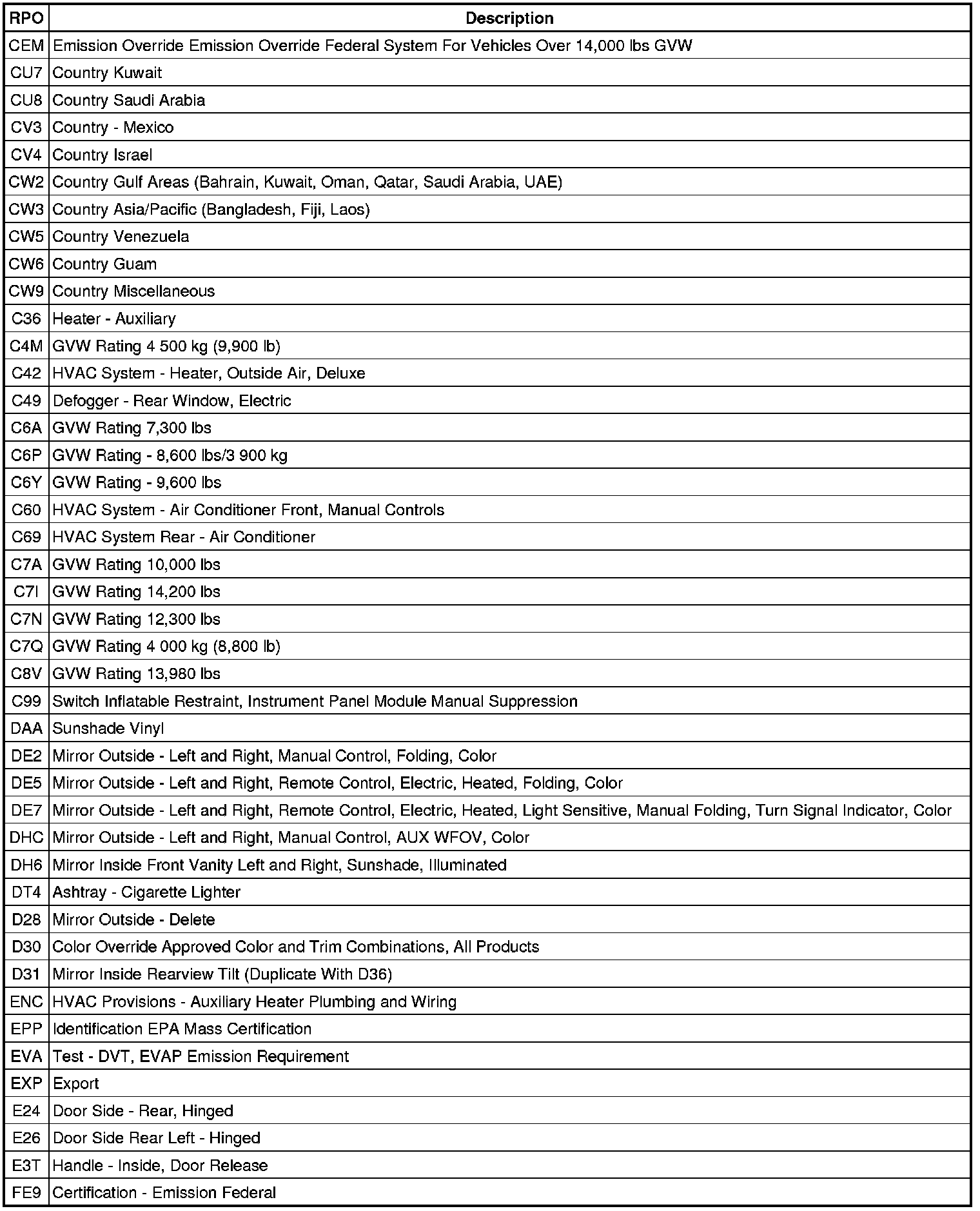 RPO Code List
