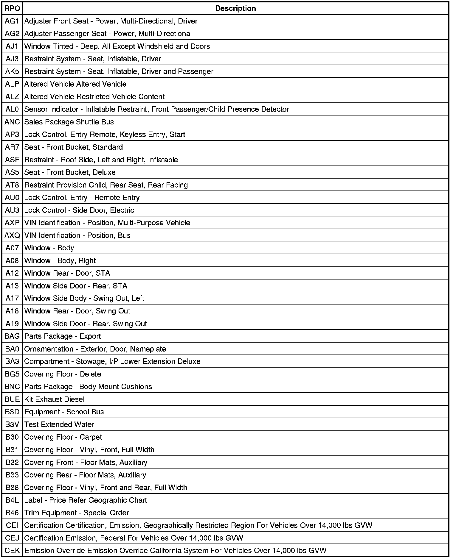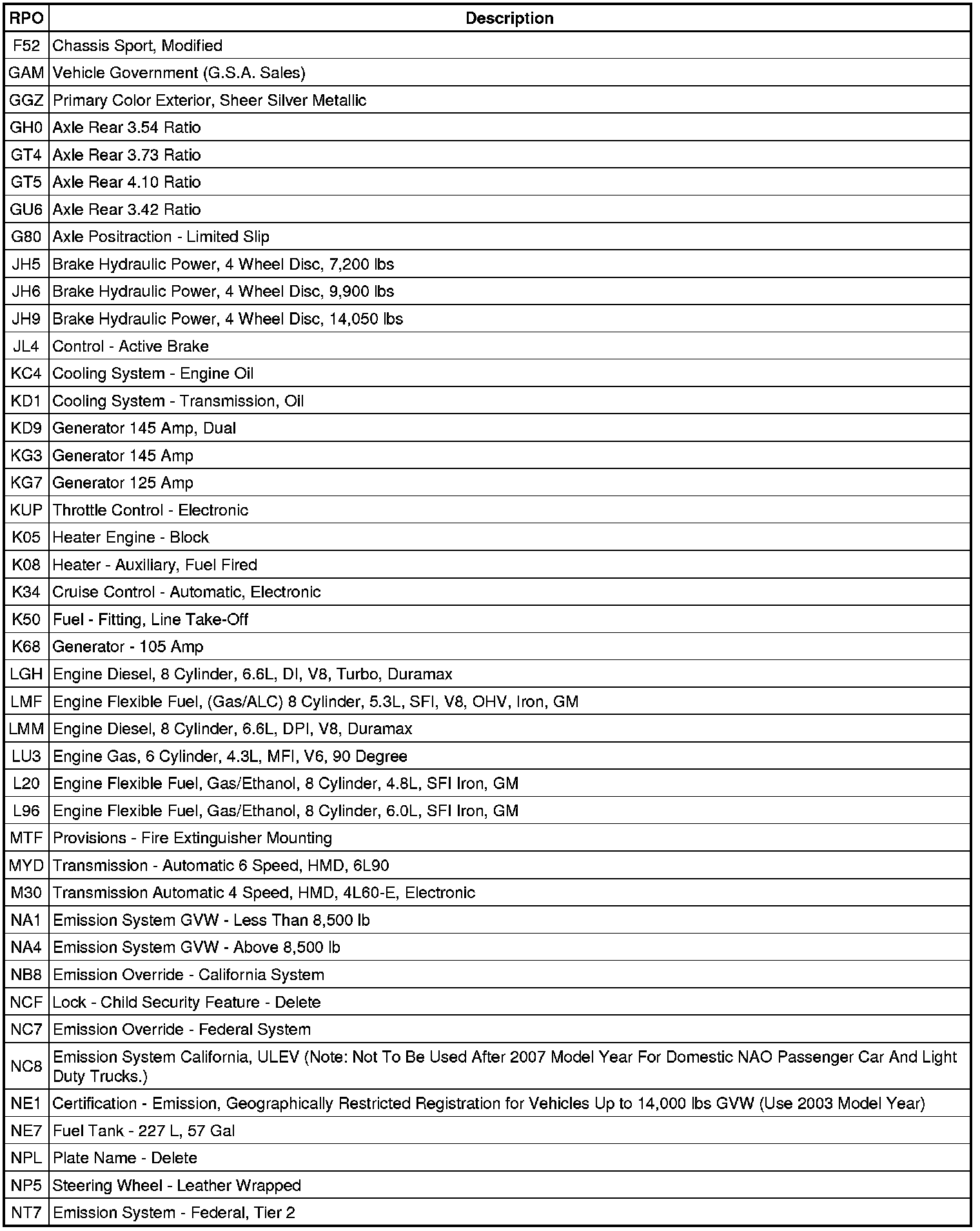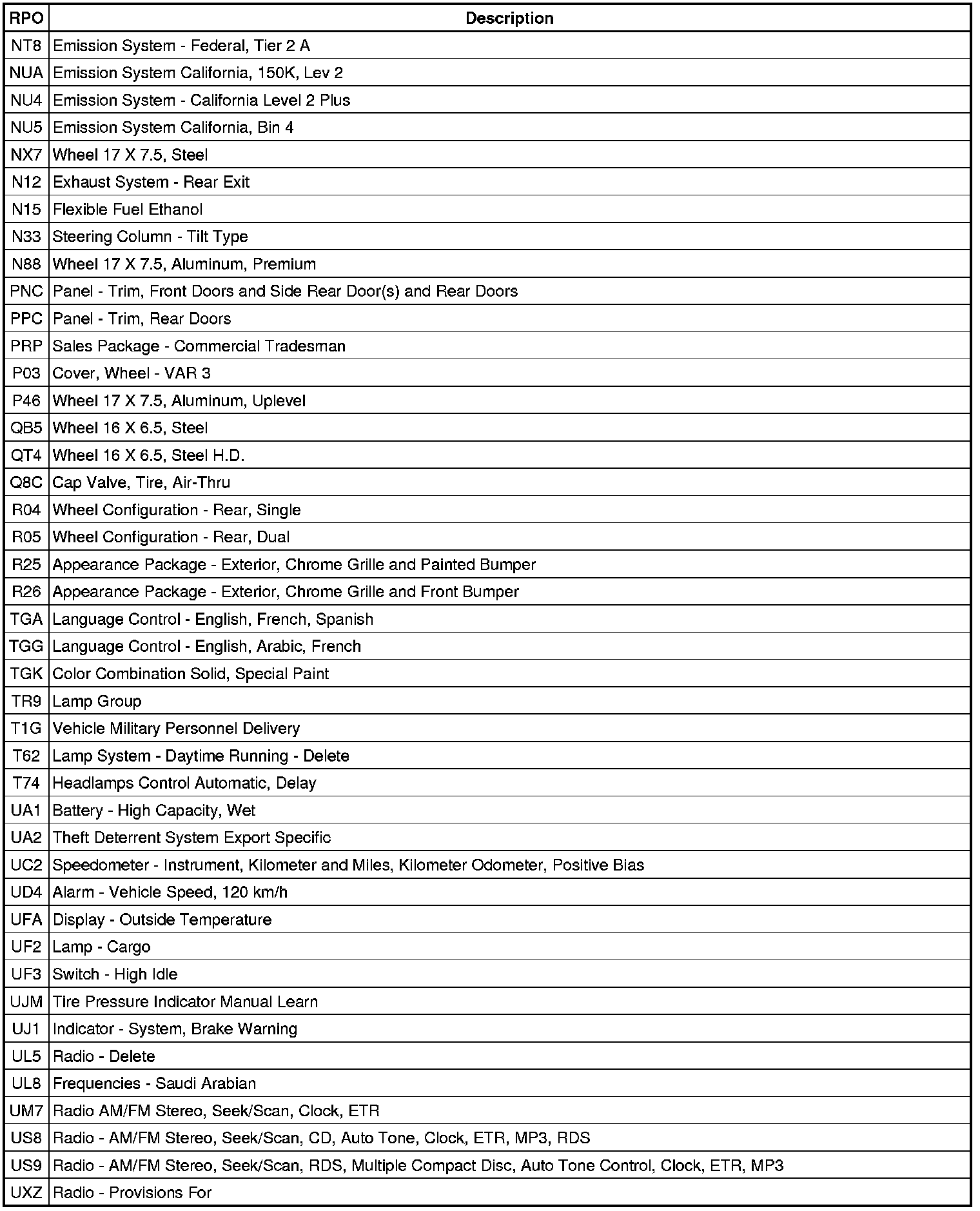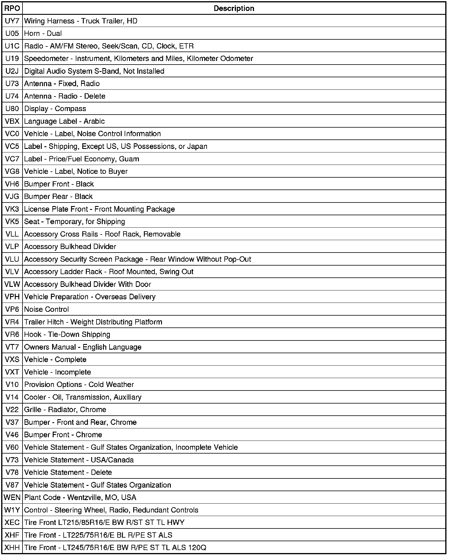 RPO Code List