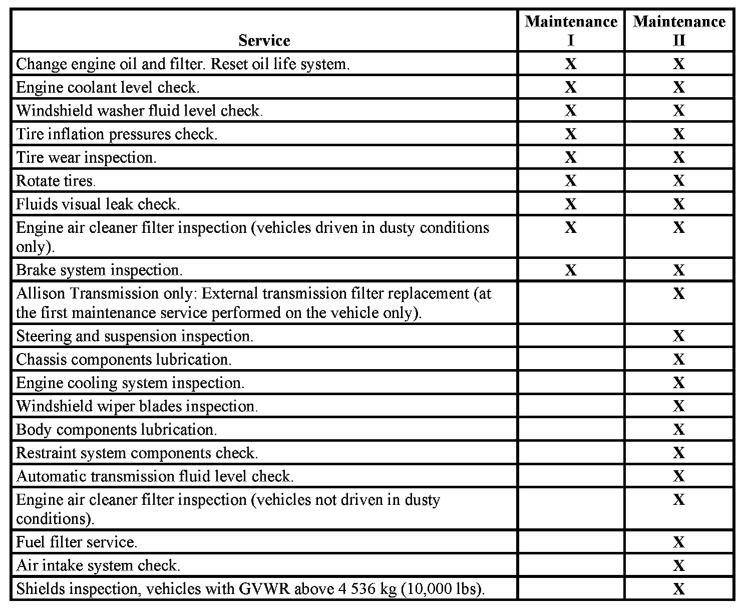 When the Change Engine Oil Soon message displays, certain services, checks, and inspections are required. The services described for Maintenance I should be performed at every engine oil change. The services described for Maintenance II should be performed when: