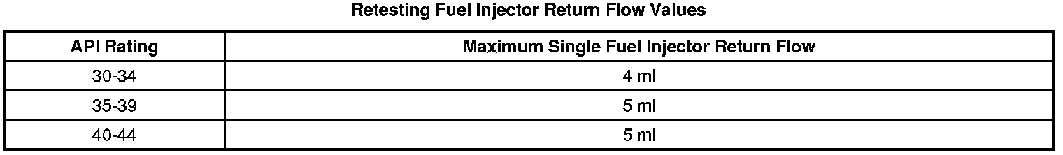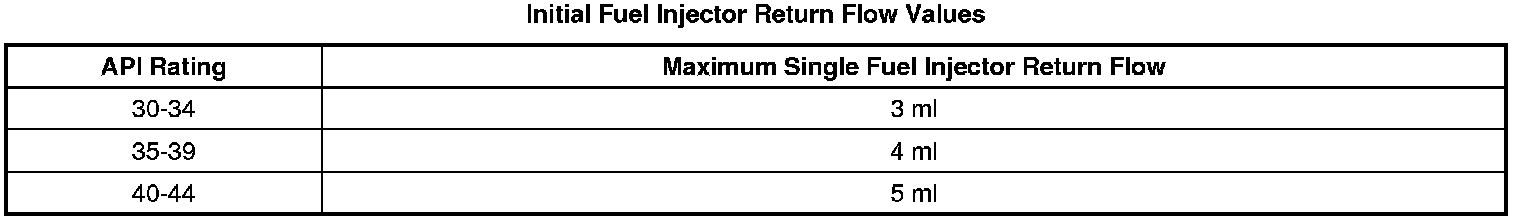 The fuel return from the fuel injectors to the tank will vary based on the API value of the fuel. Measure the Fuel API with the Diesel Fuel Quality Tester. For this reason the Fuel System Diagnosis - High Pressure Side values will vary for identifying a fuel injector or fuel pump concern. Use the following tables when referred to by the diagnostic. The first table is to be used during the initial diagnosis to identify the worst fuel injectors. After the fuel injectors that fail the first part of the test are replaced, the return flow from each passing fuel injector must be measured again. This is because the fuel system is returning less fuel to the tank, and thus the fuel pressure is higher during the retest. Failure to use the correct table may result in the replacement of good fuel injectors.