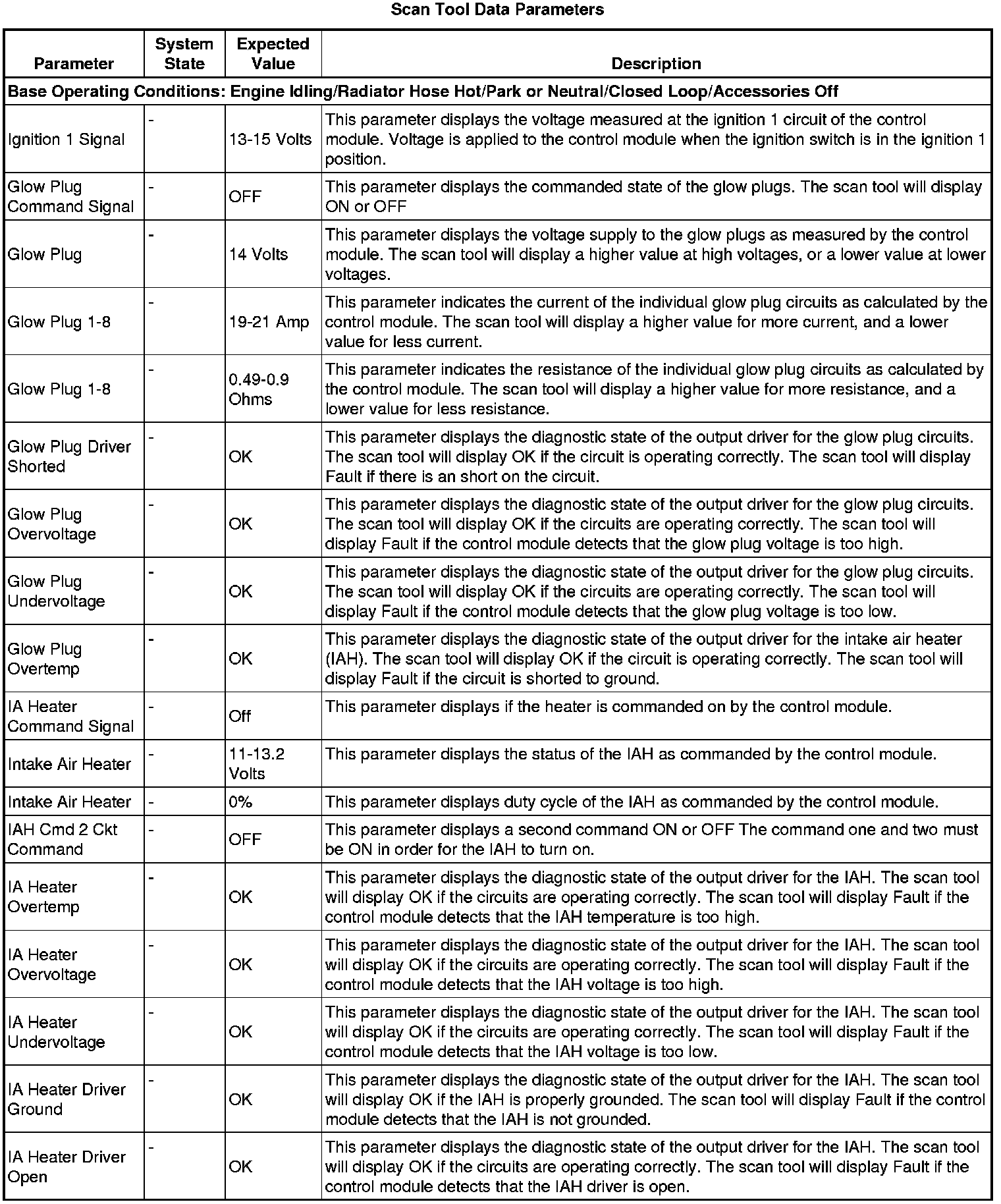 The GPCM Scan Tool Data List contains all glow plug control module related parameters that are available on the scan tool. The list is arranged in alphabetical order.