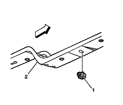 3. Install the inflatable restraint front end sensor (1) into the keyhole slot in lower radiator support (2).