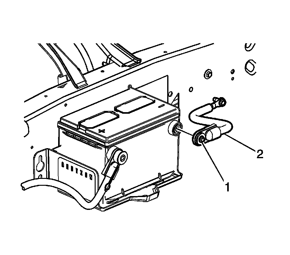 2. If applicable, install the auxiliary negative cable terminal bolt (1) and cable (2) to the auxiliary battery and tighten to 14 Nm (123 lb in).