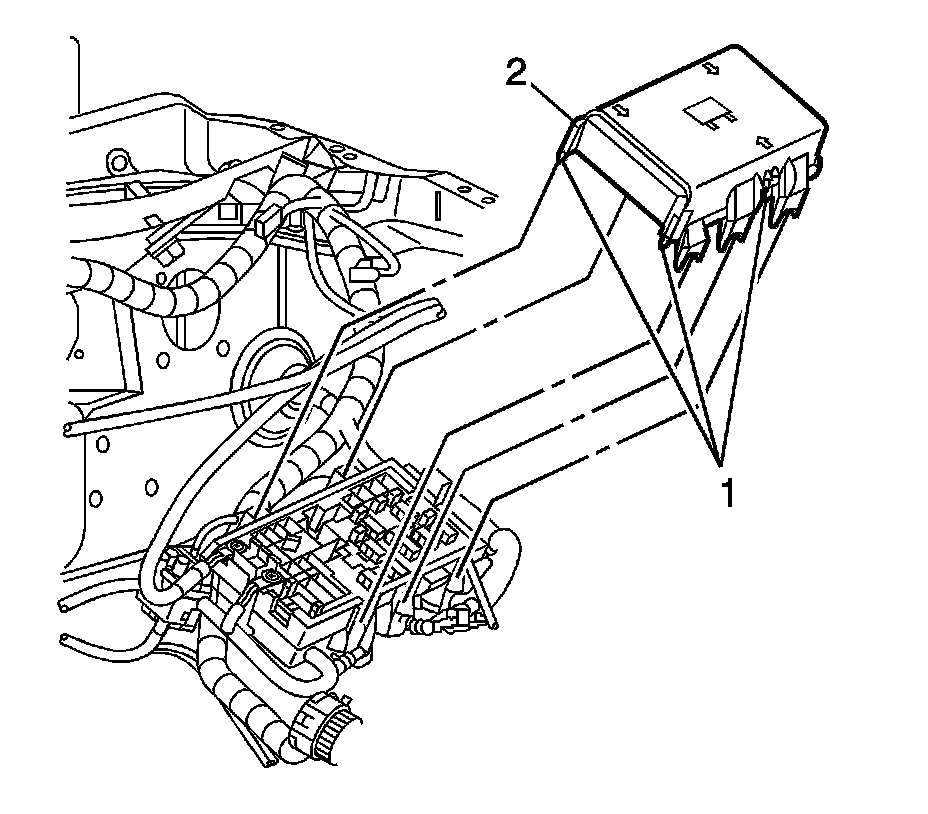 3. Press tabs (1) inward to lift and remove the large junction block cover (2).
