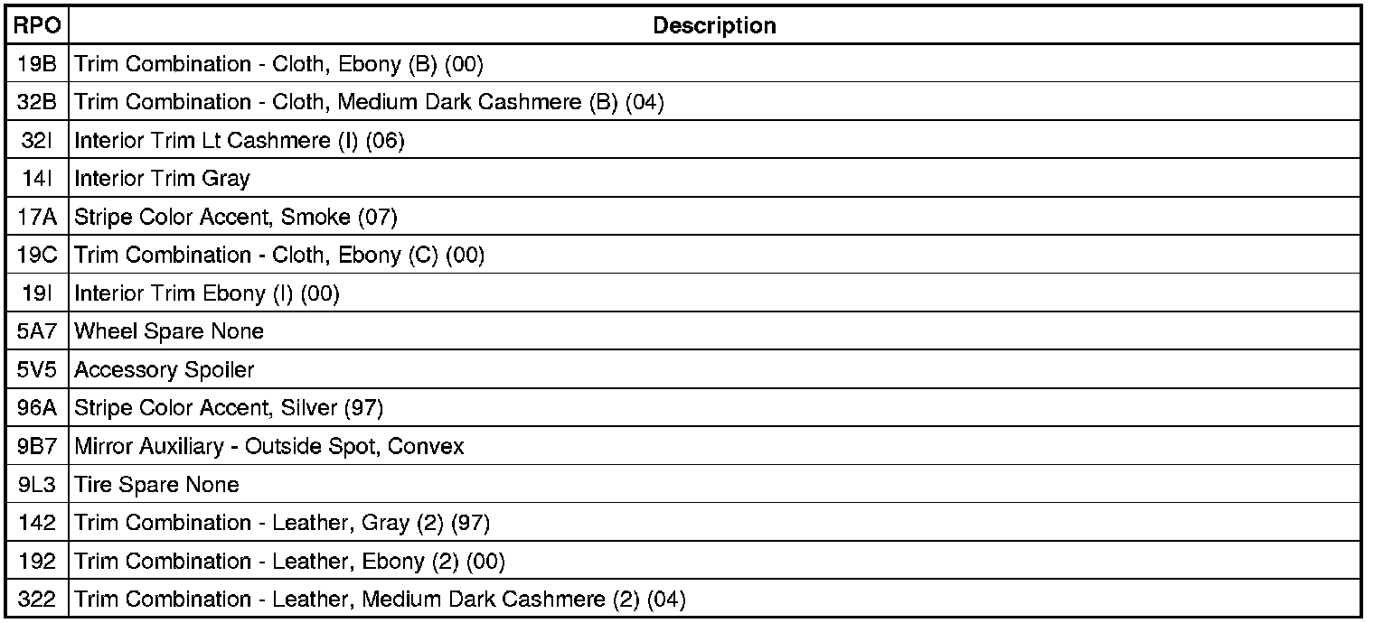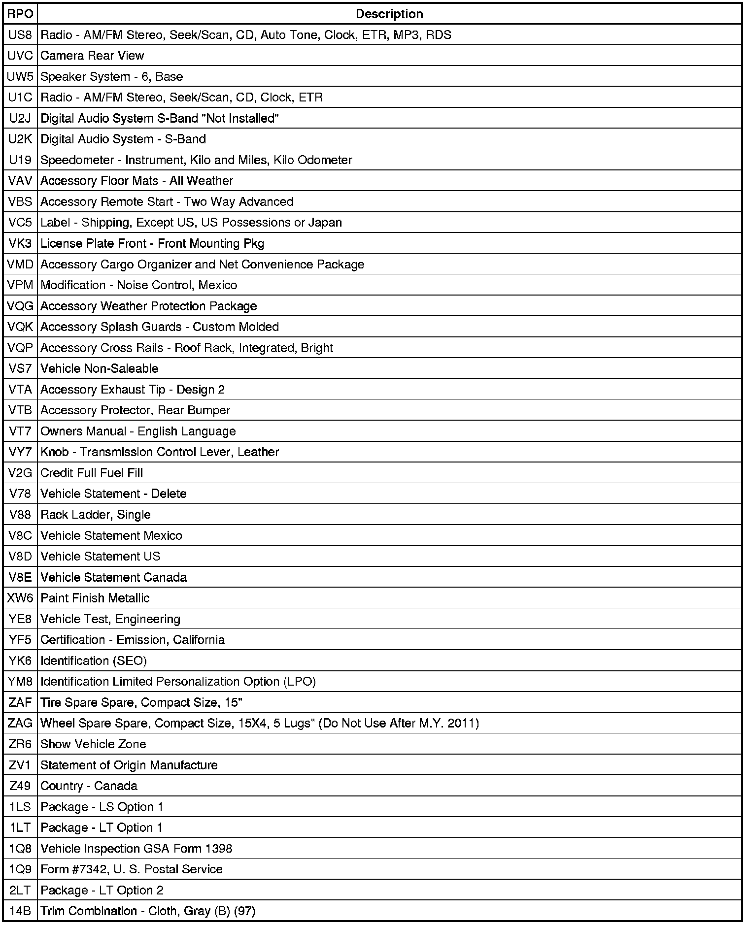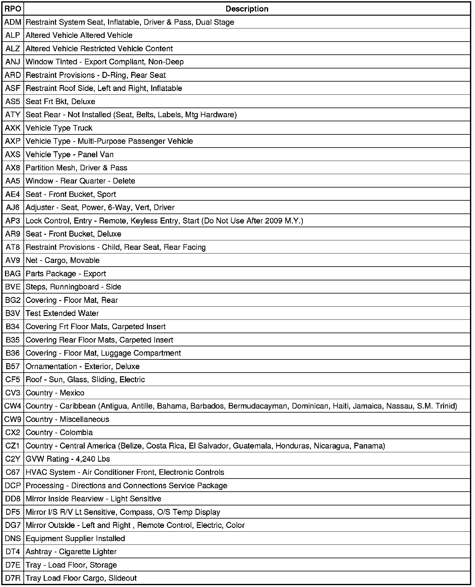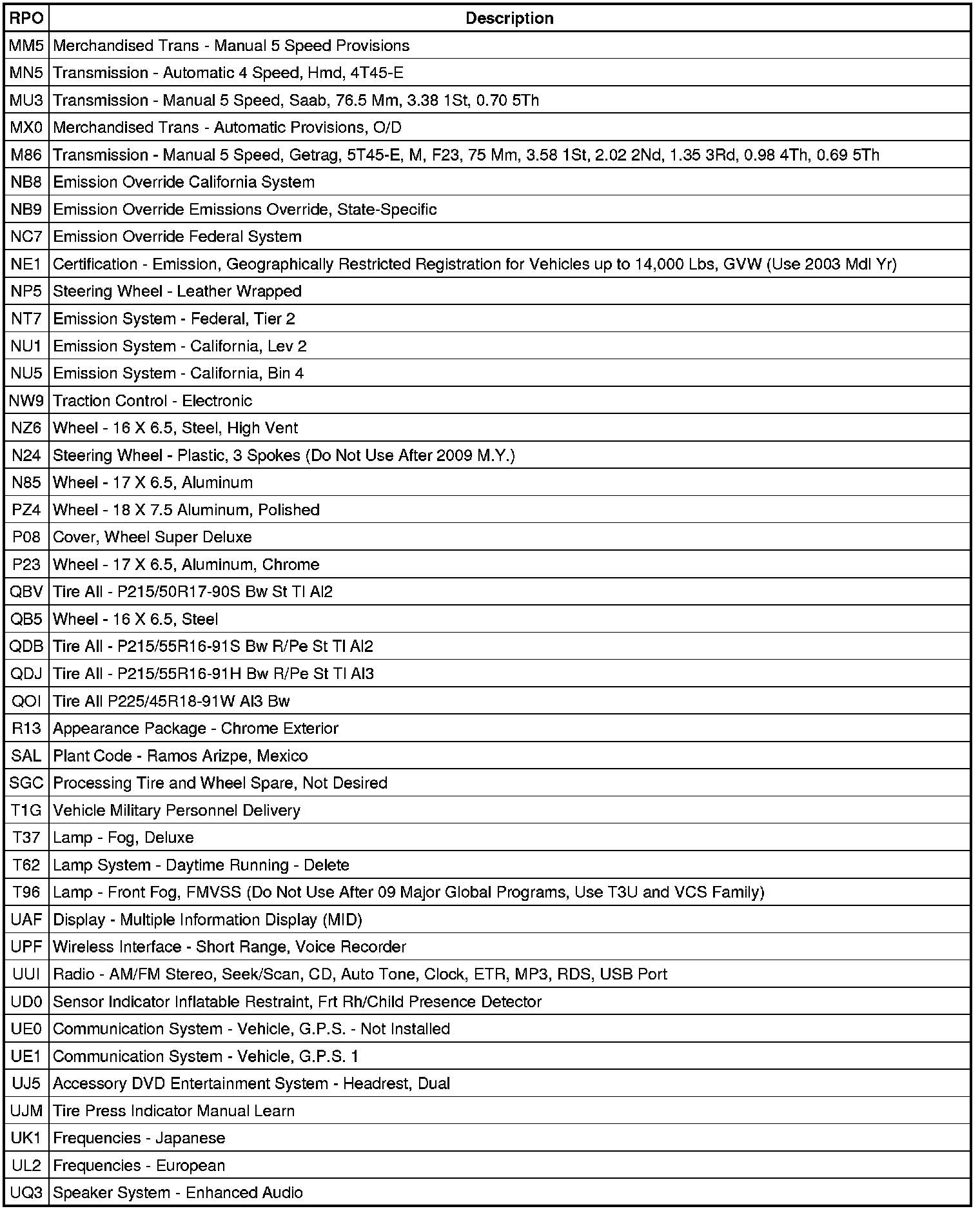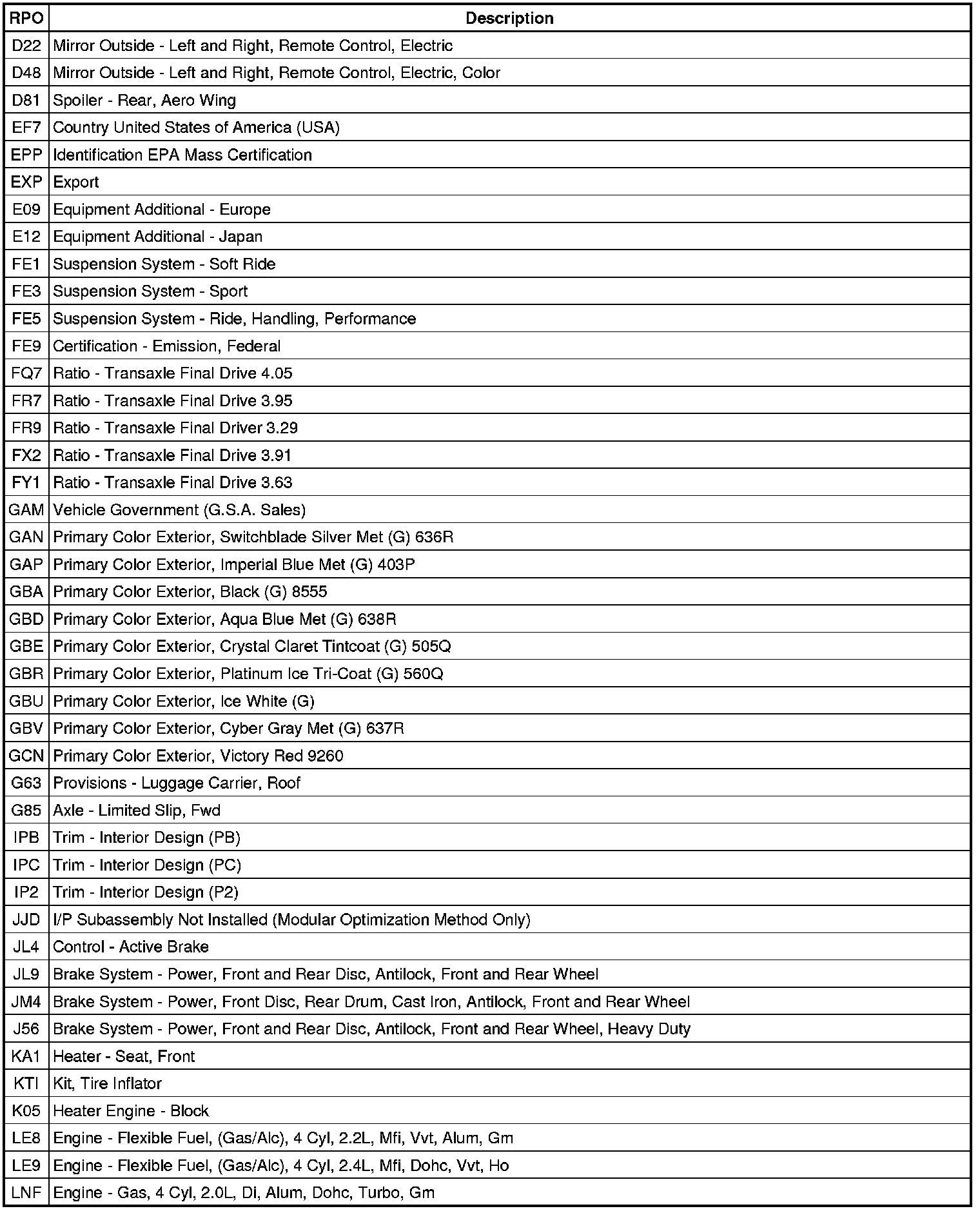 RPO Code List
