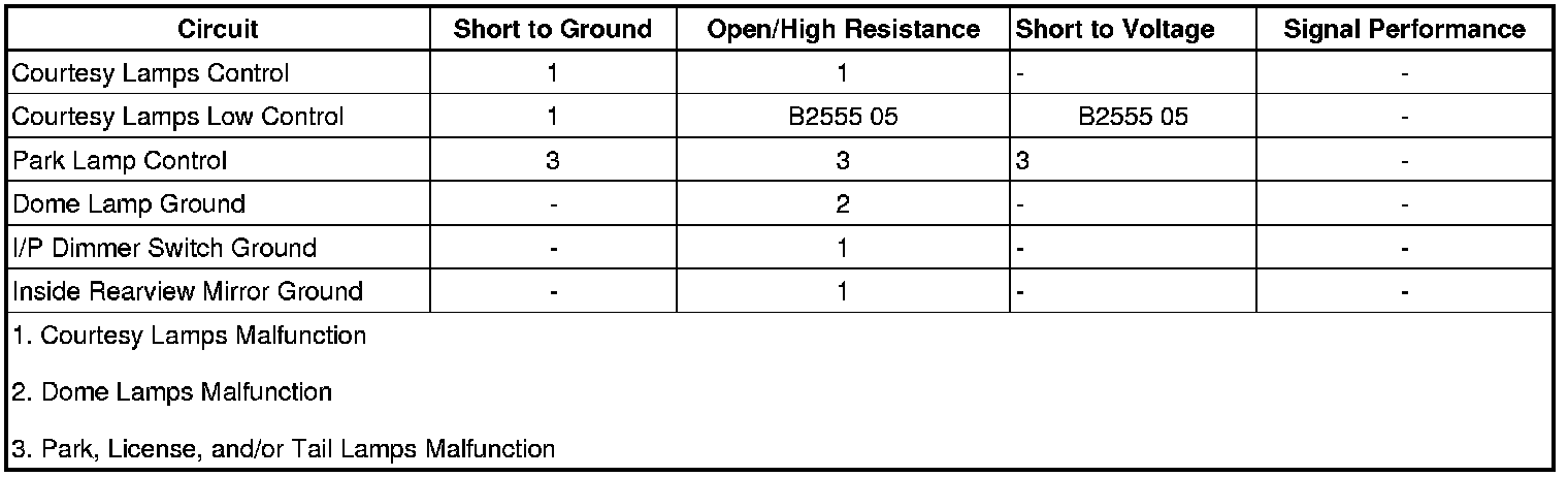• If the courtesy lamps do not illuminate when commanded, refer to Illuminated Entry Lamps Malfunction.
