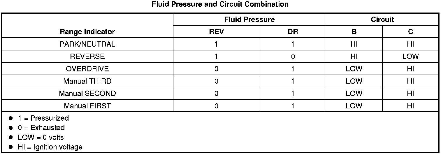 Each fluid pressure switch produces either an open or a ground to the TCM depending on the presence of fluid pressure at the switches. The sequence of open and closed switches produces a combination of voltage readings. The TCM monitors these readings.