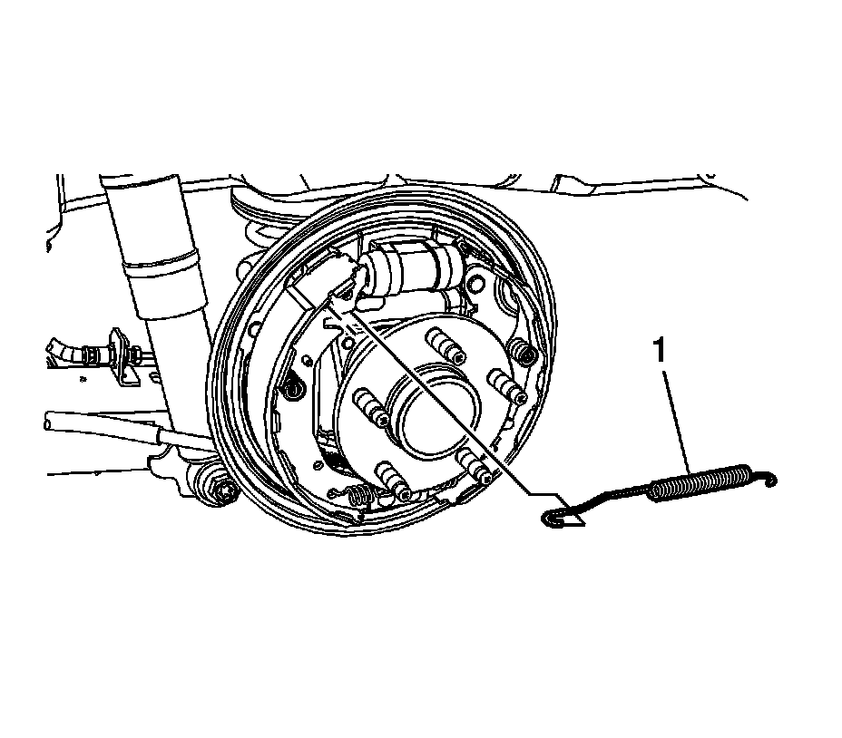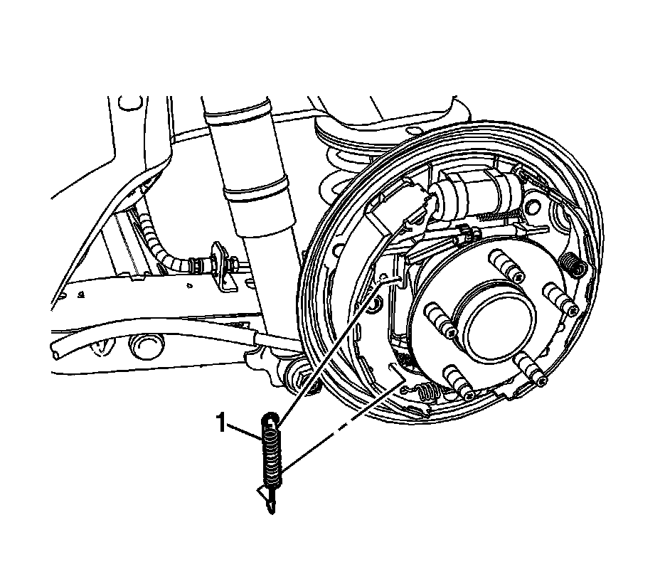 8. Rotate the primary brake shoe (1) toward the wheel hub assembly and release the brake shoe from the lower brake shoe return spring.