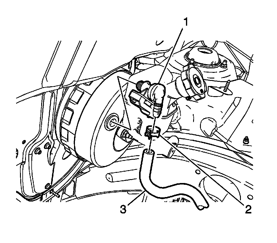 2. Position the hose clamp (2) to the vacuum hose (3) and install the hose to the power brake booster vacuum sensor.