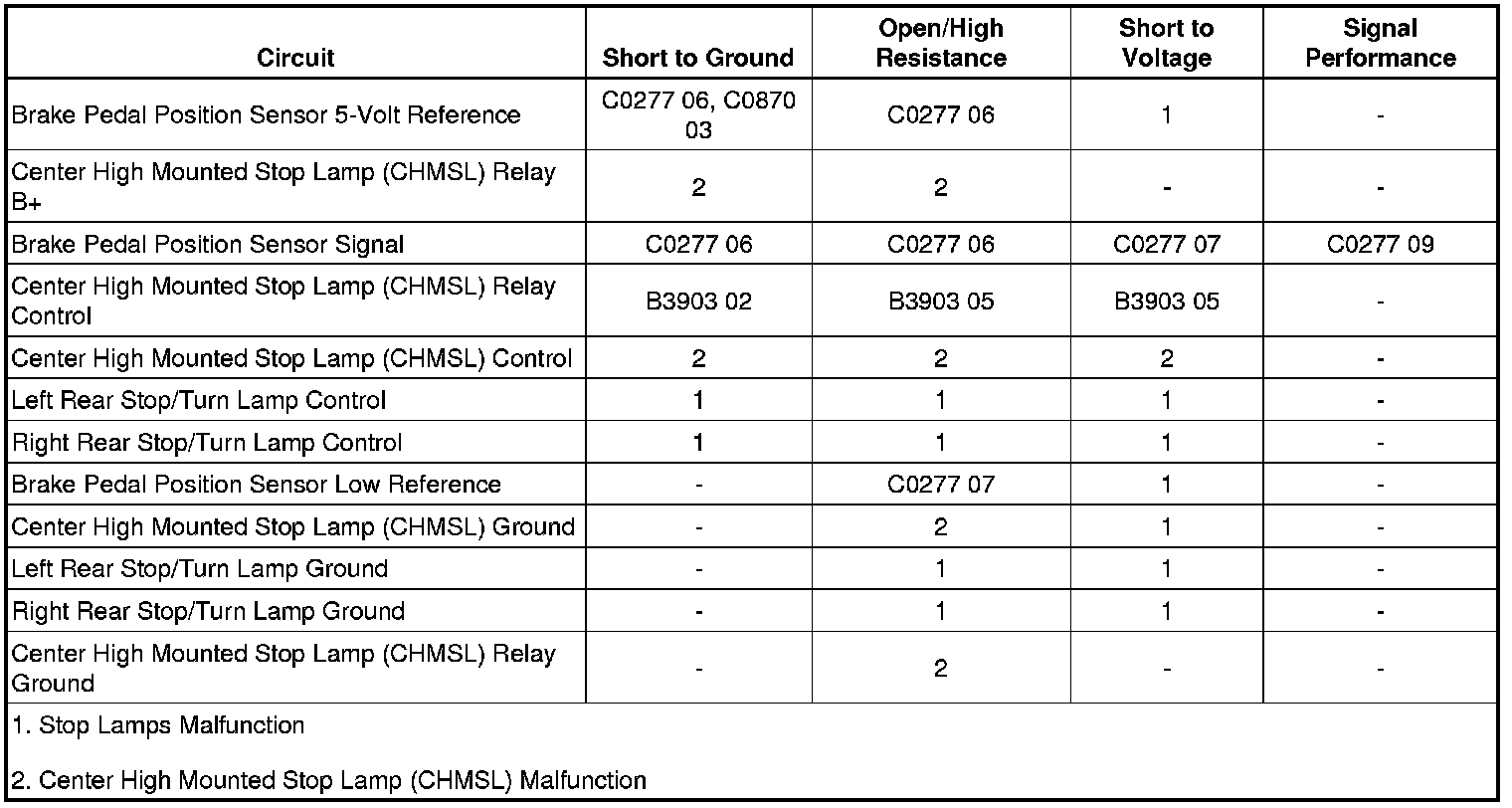 The brake pedal position sensor is used to sense the action of the driver application of the brake pedal. The brake pedal position sensor provides an analog voltage signal that will increase as the brake pedal is applied. The body control module (BCM) provides a low reference signal and a 5-volt reference voltage to the brake pedal position sensor. When the variable signal reaches a voltage threshold indicating the brakes have been applied, the BCM will apply battery voltage to the stop lamps, transmission control module (TCM), engine control module (ECM), and center high mounted stop lamp (CHMSL) relay coil. When the CHMSL relay receives battery voltage from the BCM, the relay coil is energized and the CHMSL relay switch contacts close applying battery voltage through the STOP LP fuse to illuminate the CHMSL.
