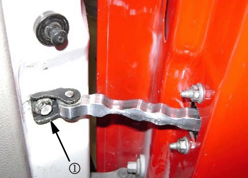 7. Remove the "B" pillar bolt (1) and the nuts (2) retaining the check link to the door.
