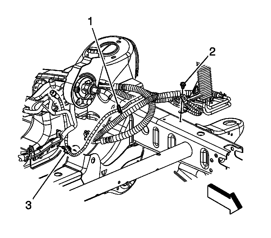 4. Remove the coolant heater cord clip (3) from the engine harness channel.