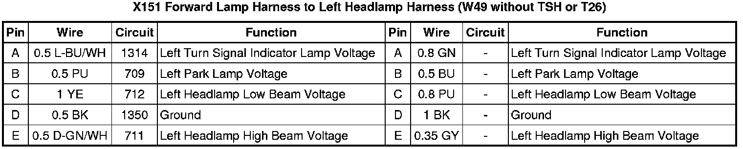 X151 Forward Lamp Harness to Left Headlamp Harness (W49 without TSH or T26)