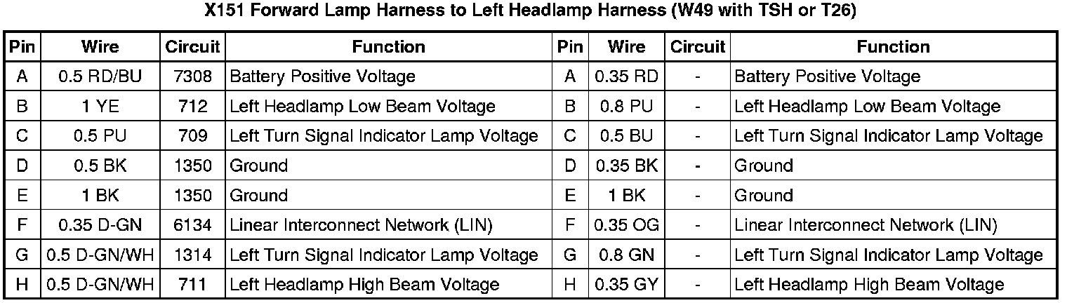 X151 Forward Lamp Harness to Left Headlamp Harness (W49 with TSH or T26)