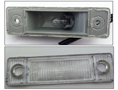 - The license lamp above exhibits a separation of the bond of the lens and housing, and a clouding of the polycarbonate lens. This condition was the result of applying chrome cleaner to the rear bumper and license lamp.