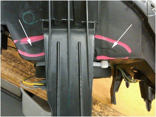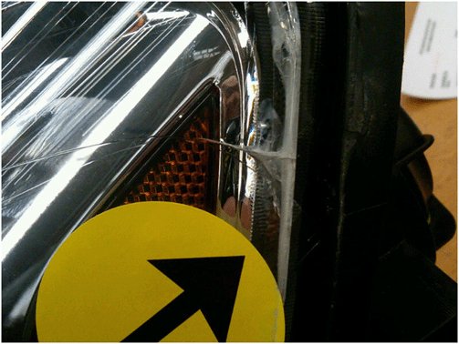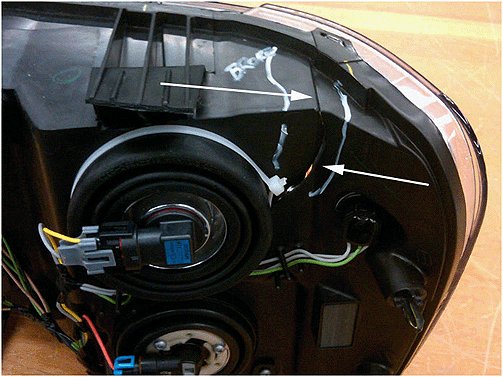 Impact Damage is most often presented as the assembly is holding moisture, is inoperative, or blemished. Today's acrylic headlamp lenses are very tough and will withstand normal stone strikes without damage. They are also tough enough to not show witness marks of impacts severe enough to damage the rear housing. This damage is often revealed through close visual inspection once the lamp is removed. Broken mounting tabs, rear housing fractures, and loose components inside the lamp assembly are evidence if impact damage. When writing up these concerns never assume it will automatically be a warranty repair. Inspection of the lamp assembly, once removed from the vehicle, will be required to assess warrantability.