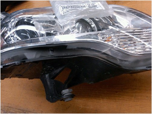 This housing is cracked across the top of the housing just below the mounting tab. Not shown is the dent at the upper edge of the lens where it impacted an object.