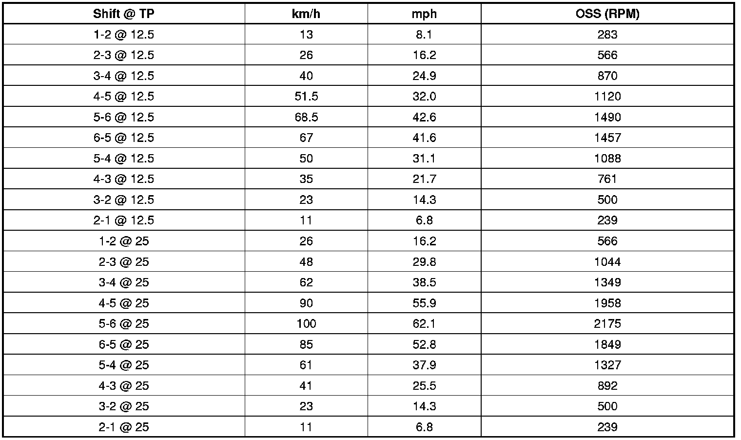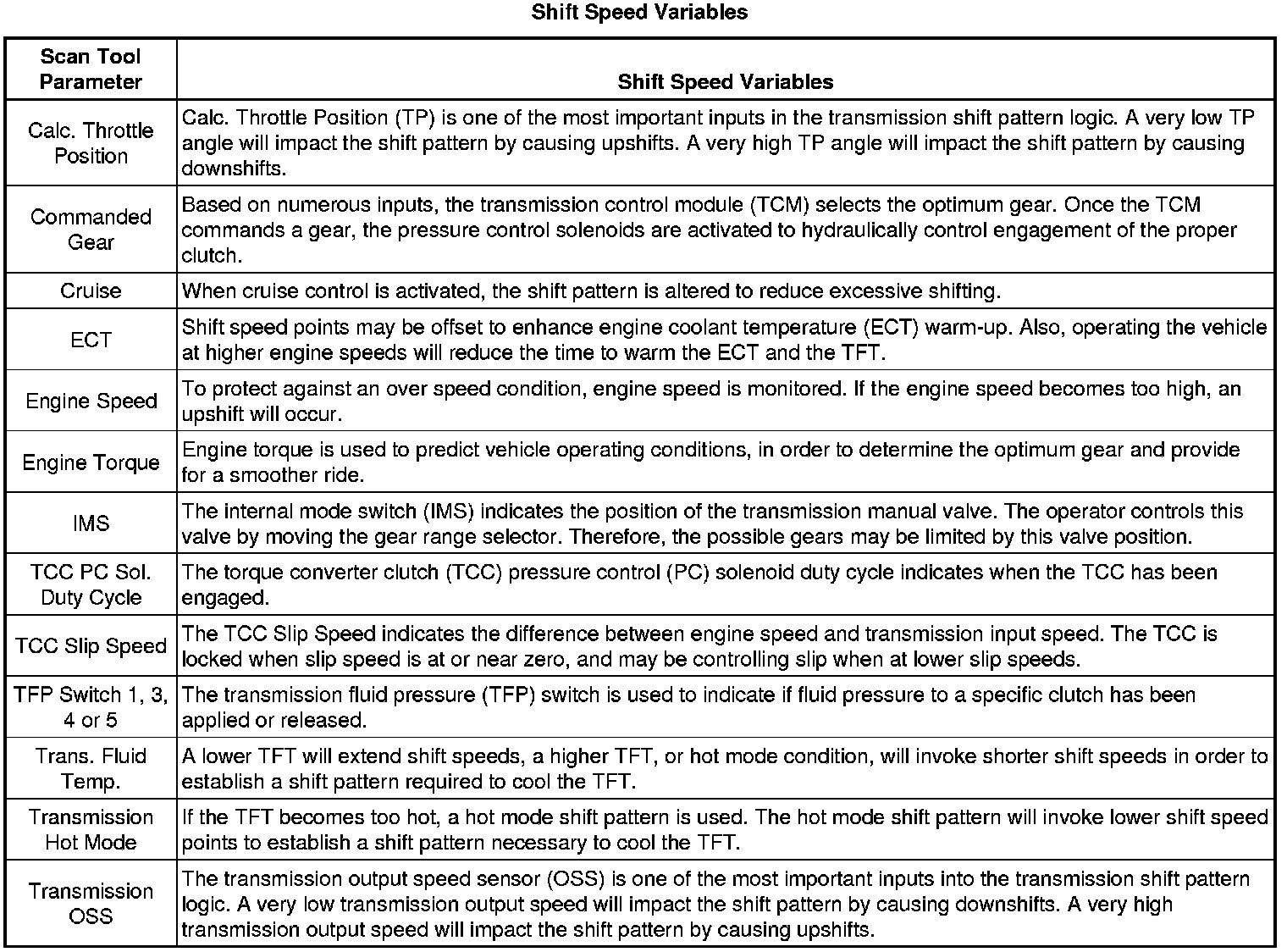 Note: Shift speed points are affected by many different vehicle and transmission operating conditions. The table above represents shift speed points calibrated at specific throttle angles during normal operating conditions and a temperature range between 0-130°C (32-266°F). These shift speed points are also based on an effective final drive ratio of 3.16, and assume a production-intent tire size. The table below illustrates a number of different variables that influence these shift speed points. Based on a given operating condition, these variables may override the normal shift speed points. To assist in monitoring the different variables, the respective scan tool data parameter is also listed.