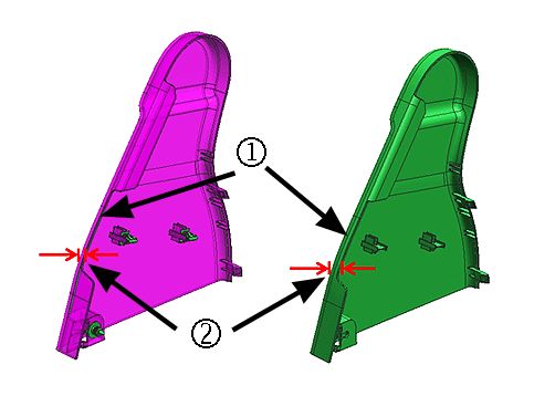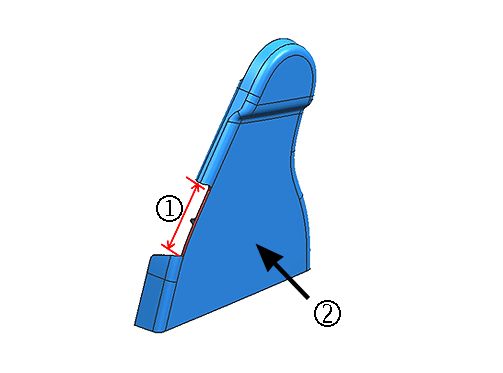 The material to be removed is the standing ledge (1) in the notched-out opening, shown in the examples above. Depending on the design and seat configuration, approximately 12-15 mm (15/32-19/32 in) of material (2) will need to be removed so that the entire flange is removed all the way to the vertical wall of the cover.