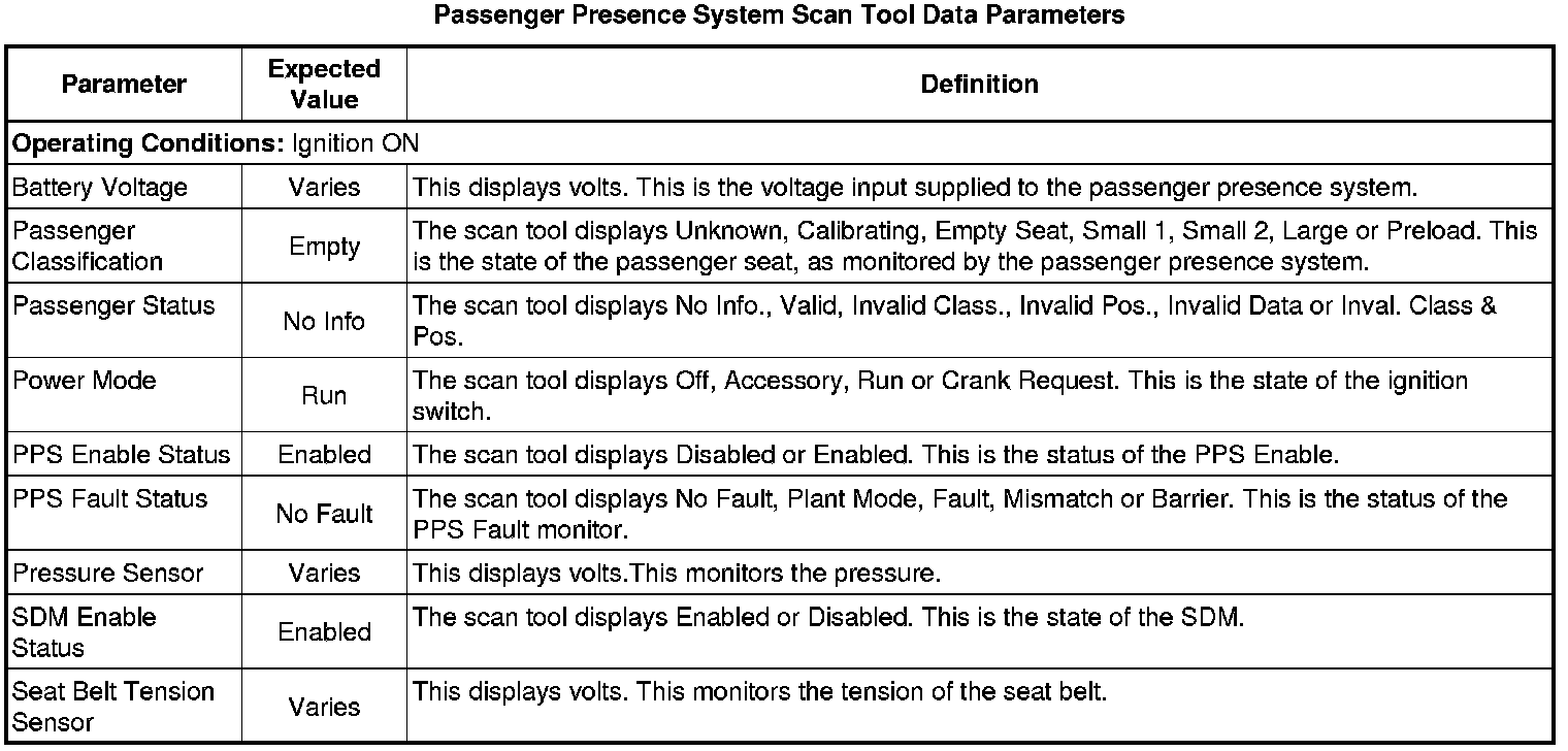 Inflatable Restraint Passenger Presence System Scan Tool Information