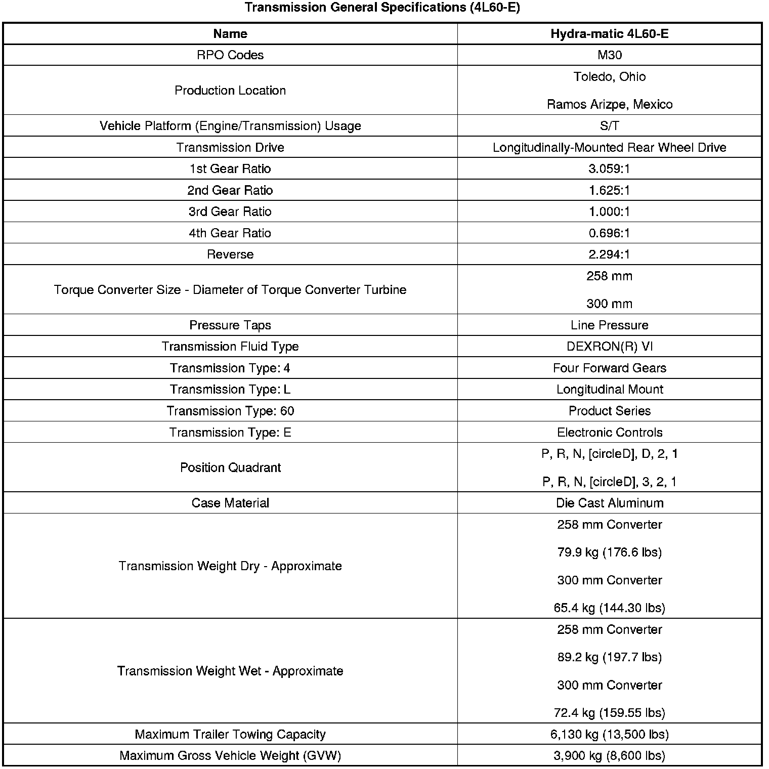 Transmission General Specifications