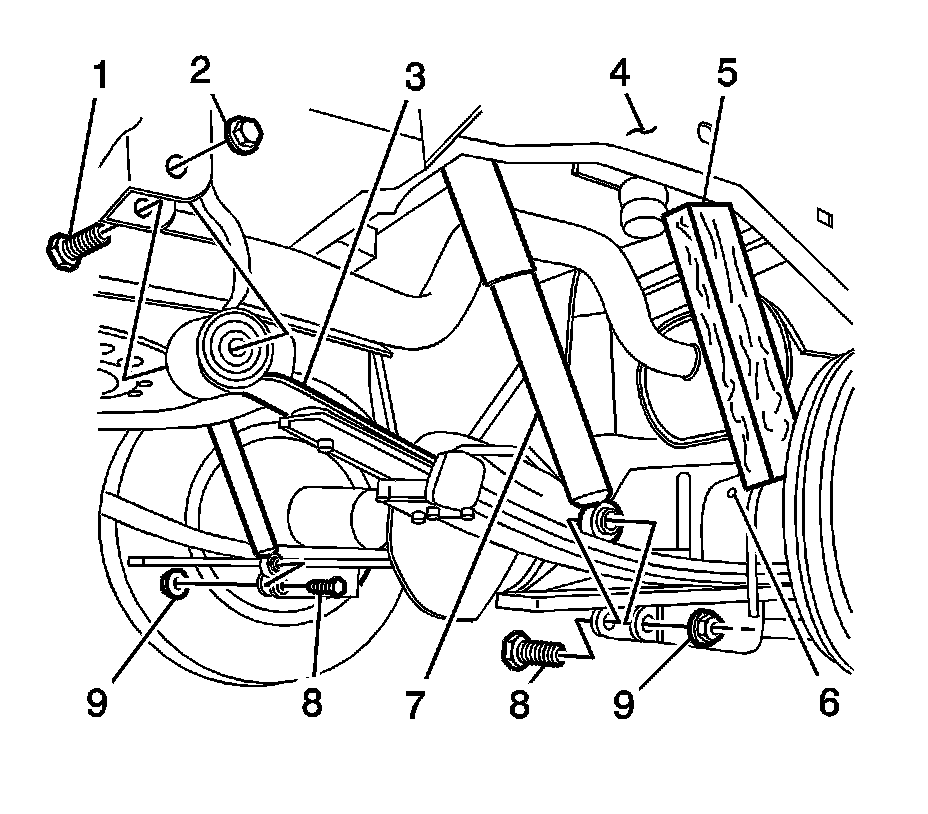 7. Install the lower shock absorber bolts (8) and nuts (9) and tighten to 95 Nm (70 lb ft).