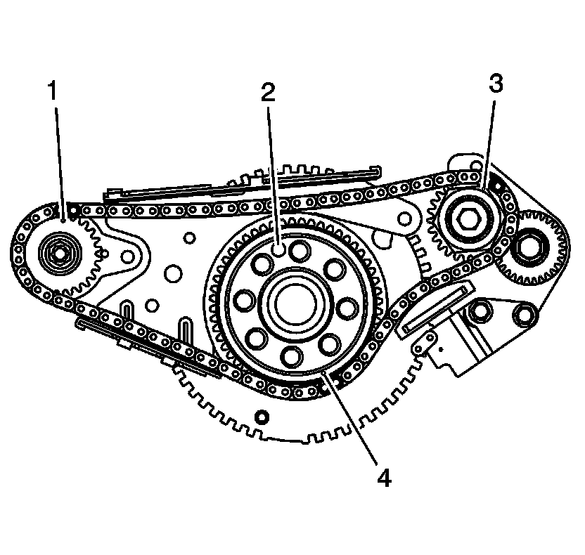 1. The right hand balance shaft sprocket timing mark (3) should be at 2:30 position.