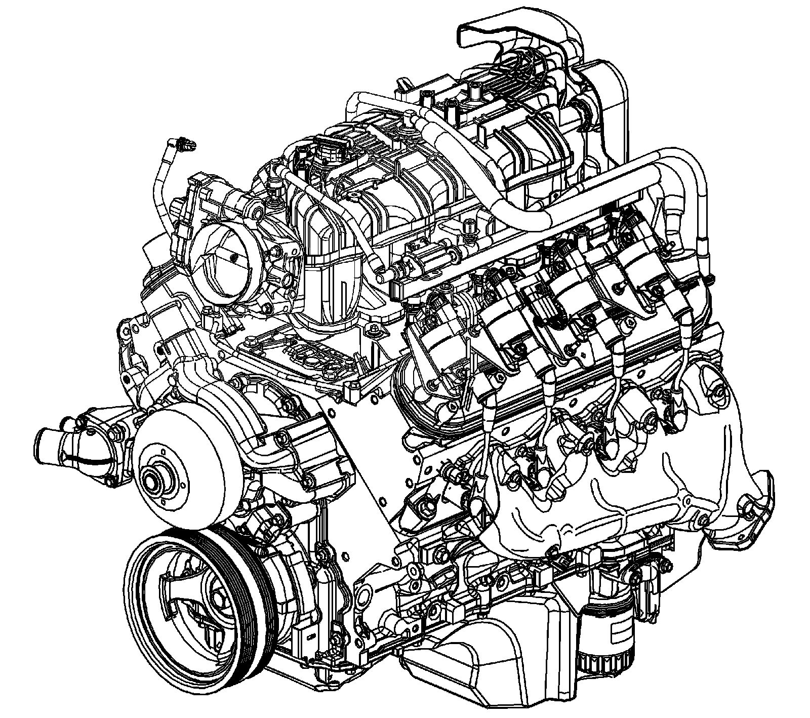 The intake manifold is a 1 piece composite design that incorporates brass threaded inserts for mounting the fuel rail, throttle body, and wire harness studs. Each side of the intake manifold is sealed to the cylinder head by a non-reusable silicone sealing gasket/nylon carrier assembly. The electronically actuated throttle body bolts to the front of the intake manifold. The throttle body is sealed by a 1 piece push in place silicone gasket. The fuel rail assembly, with 8 separate fuel injectors, is retained to the intake by 4 bolts. The injectors are seated into their individual manifold bores with O-ring seals to provide sealing. A fuel rail stop bracket is retained to the rear of the left cylinder head by a mounting bolt. The manifold absolute pressure (MAP) sensor is installed and retained to the top front of the intake manifold and sealed by an O-ring seal. The evaporative emission (EVAP) canister purge solenoid valve is mounted to the fuel rail at the left front of the intake manifold. There are no coolant passages within the intake manifold.