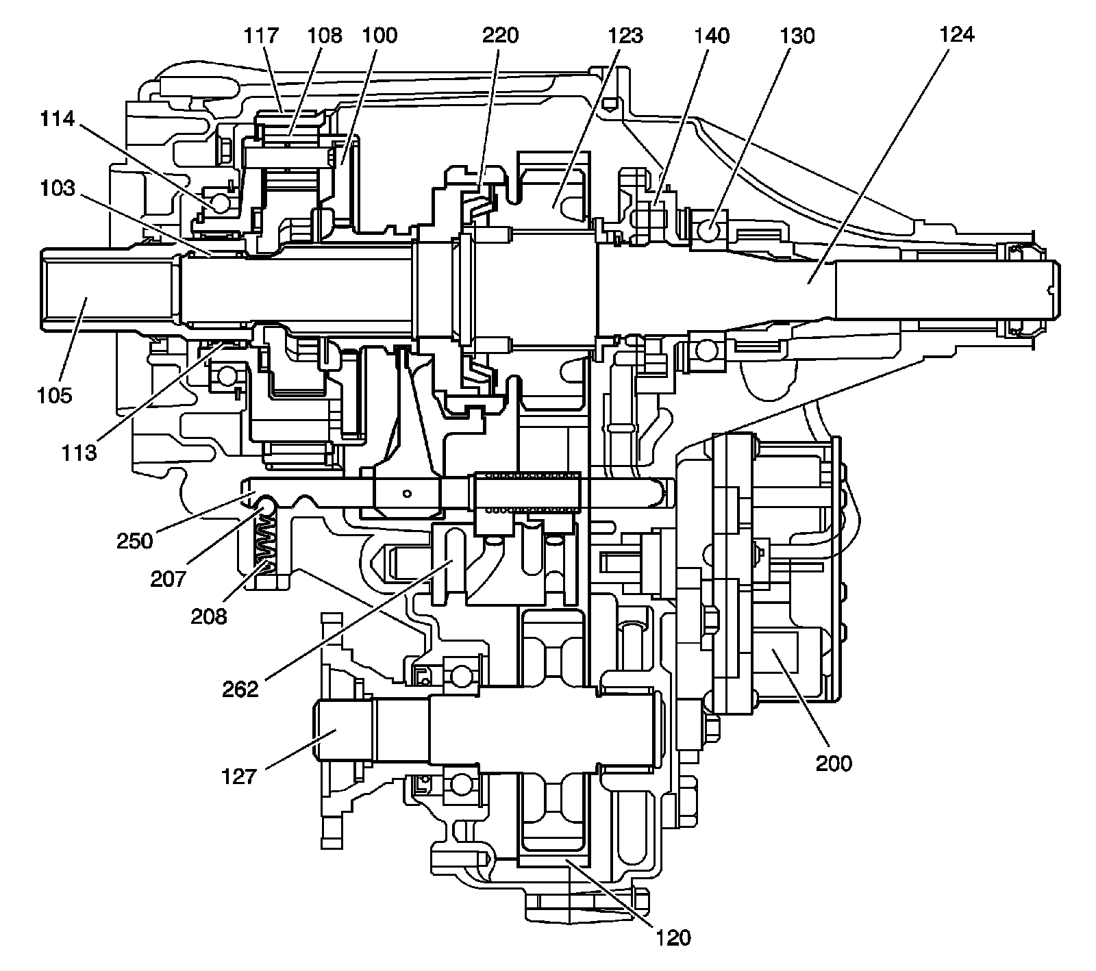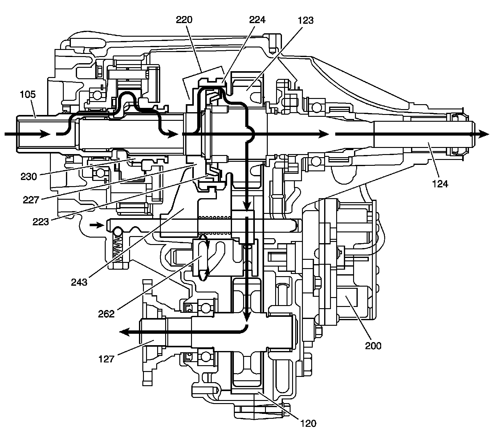 The outer teeth, or low range teeth, on the input shaft (105), which now acts like a sun gear, delivers the engine power to the pinion gears (108) in the planetary carrier (112). Rotating the pinion gears (108), which are engaged in the annulus gear (117), rotates the planetary carrier (112). The planetary carrier (112) delivers the power to the high/low range sleeve (230). The high/low range sleeve (230) then drives the rear output shaft (124), providing a 2.48:1 reduction to the speed of the rear output shaft (124). The 2/4 wheel drive synchronizer is still engaged, and engine torque is delivered to front and rear propeller shafts.