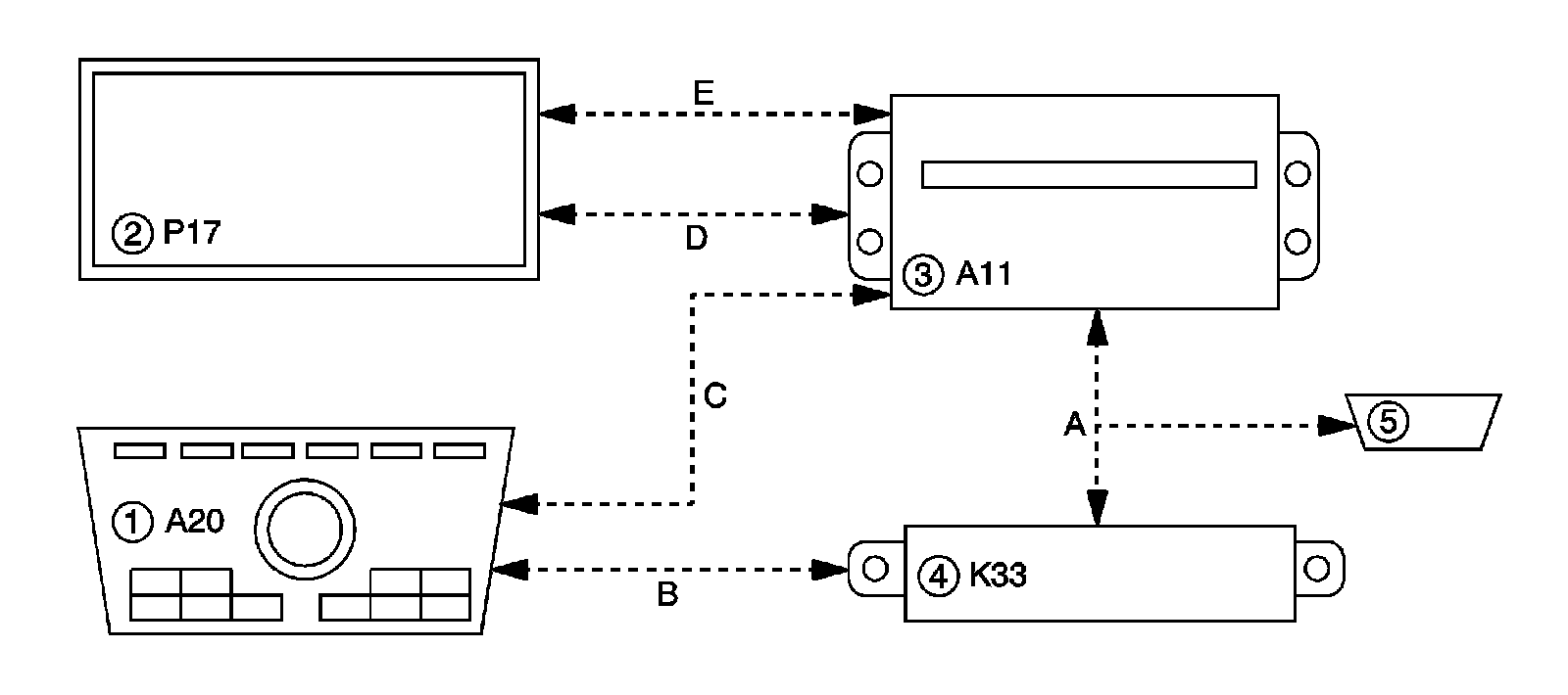 When equipped with the navigation radio, the radio/HVAC controls communicate radio control inputs directly to the navigation radio with the CAN Graphical Interface (CGI) data circuits. After receiving the message the radio will perform the requested function. Messages communicated between the radio and the radio/HVAC controls include the following: