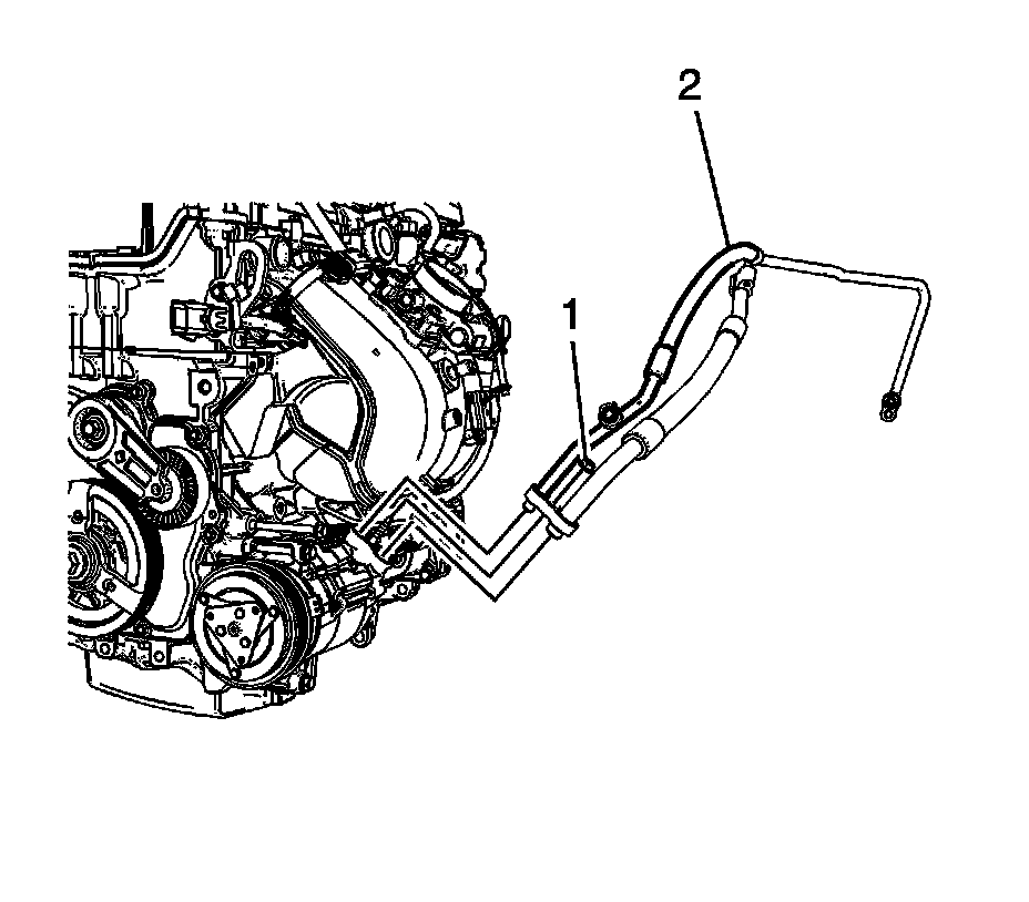 10. Remove the A/C line nut (1) and line (2) from the compressor and reposition the line to the side.