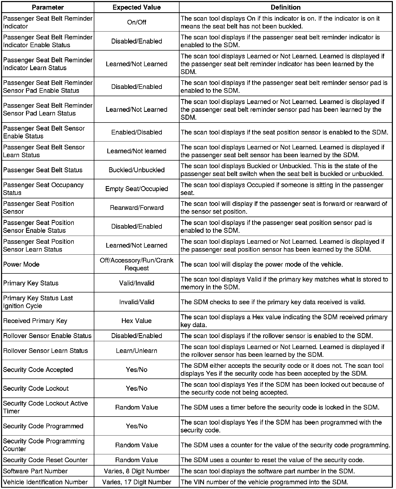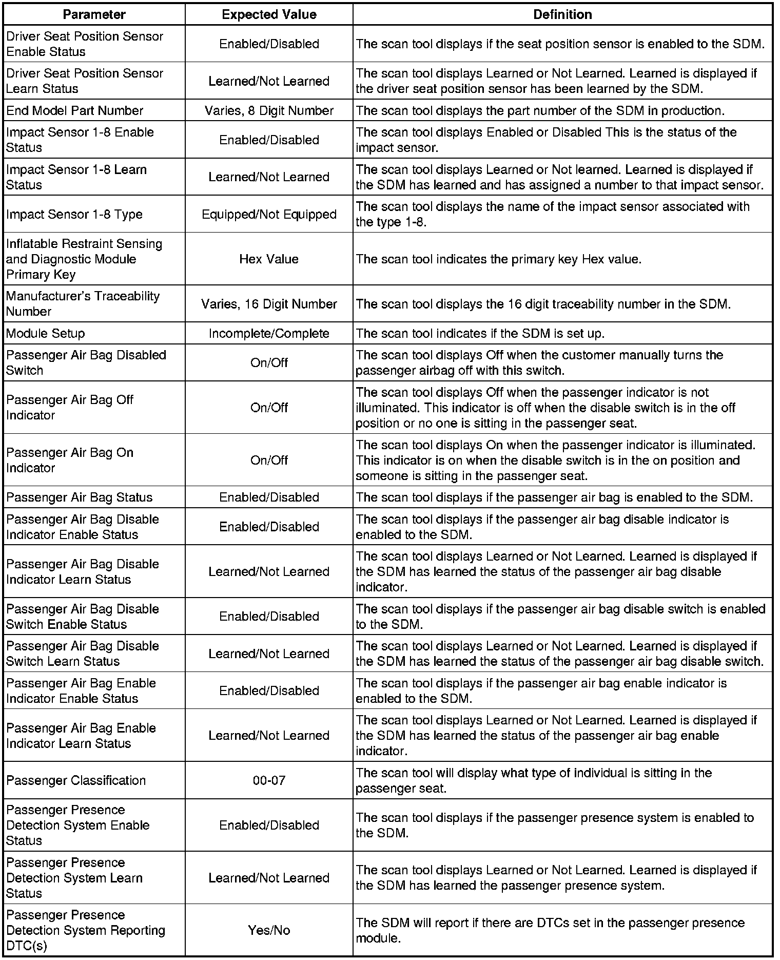 Inflatable Restraint Sensing and Diagnostic Module Scan Tool Information