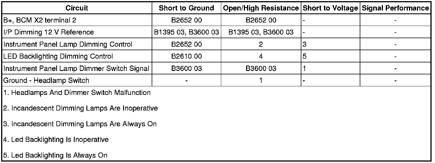The body control module (BCM) supplies a voltage reference through the instrument panel (I/P) dimming voltage reference circuit to the interior lamp dimmer switch, which is part of the headlamp switch. When the dimmer switch is placed in a desired brightness position, reference voltage is applied through the dimmer switch rheostat and the I/P lamps dimmer switch signal circuit to the BCM. The BCM interprets this voltage signal, then applies a pulse width modulated (PWM) voltage through the instrument panel lamp dimming control circuit and the LED backlighting dimming control circuit illuminating all backlighting lamps.