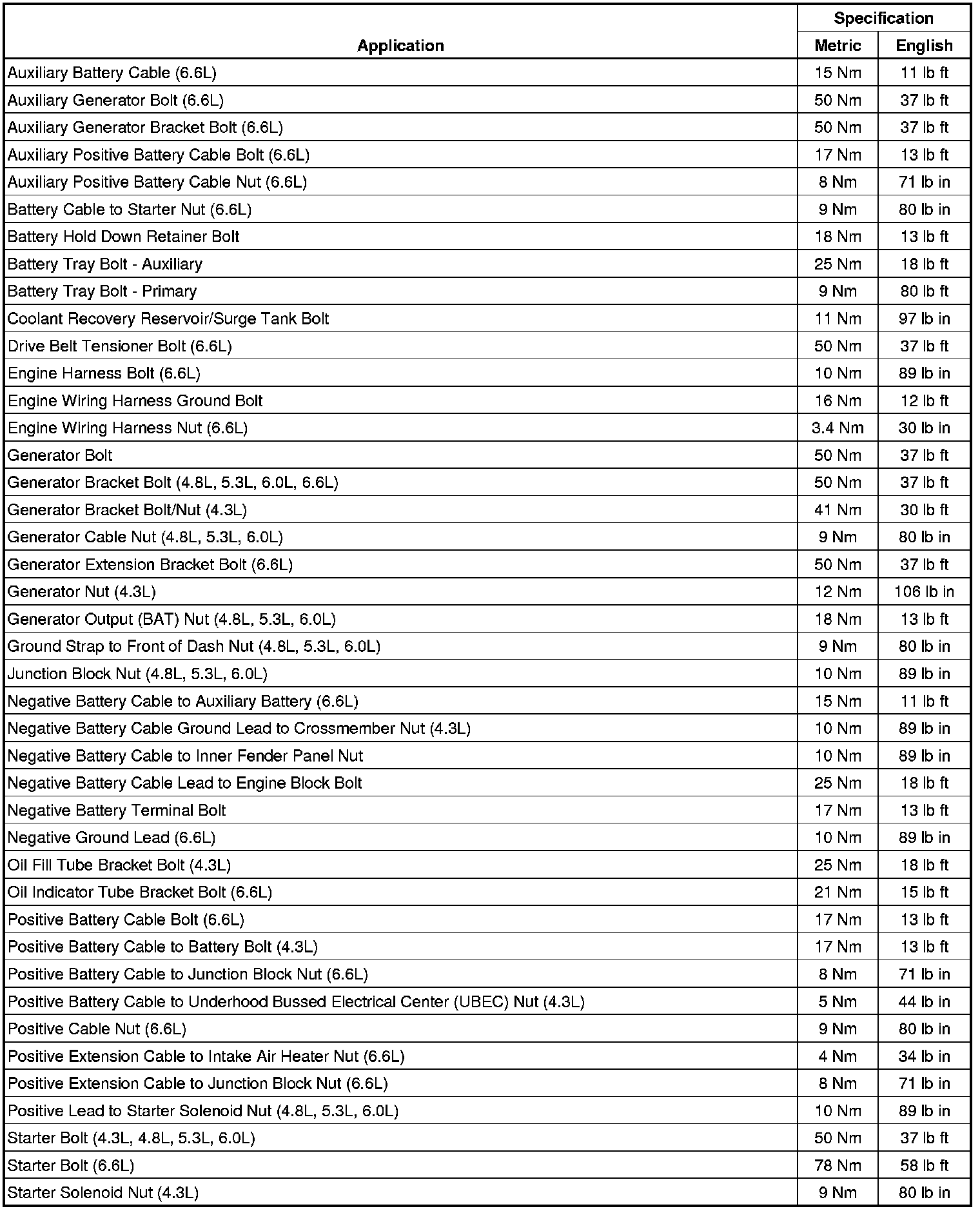 Starting and Charging: Specifications