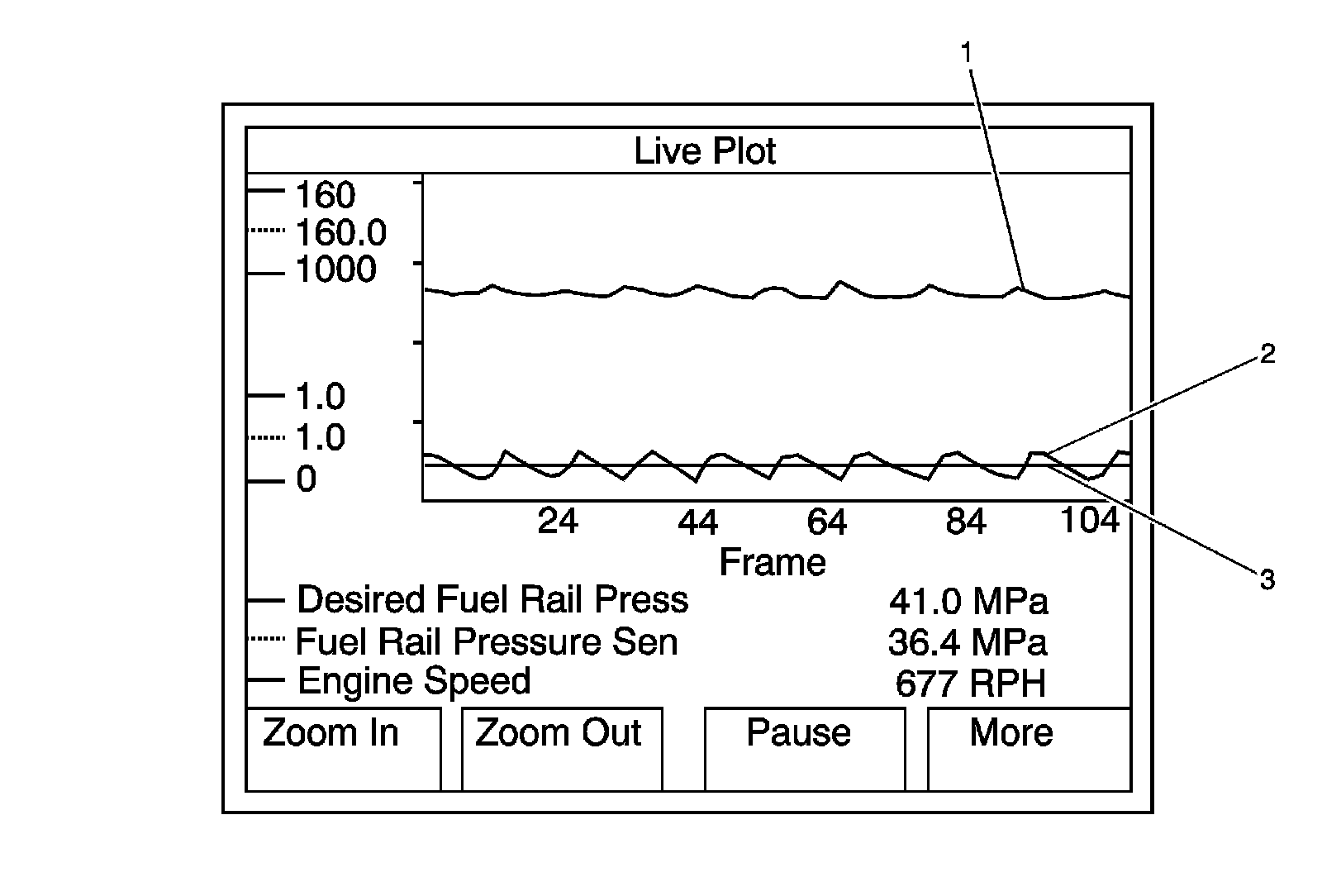 4. If there is a violent fluctuation in the Fuel Rail Pressure, as seen in the surging graph below, replace the Q45A fuel pressure regulator 1. Refer to Fuel Pressure Regulator Replacement (Service and Repair).