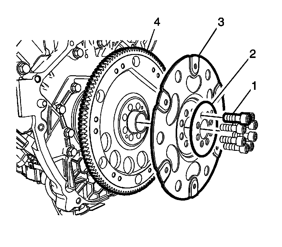 10. Remove the flywheel bolts (1), washer (2), flexplate (3) and flywheel (4).