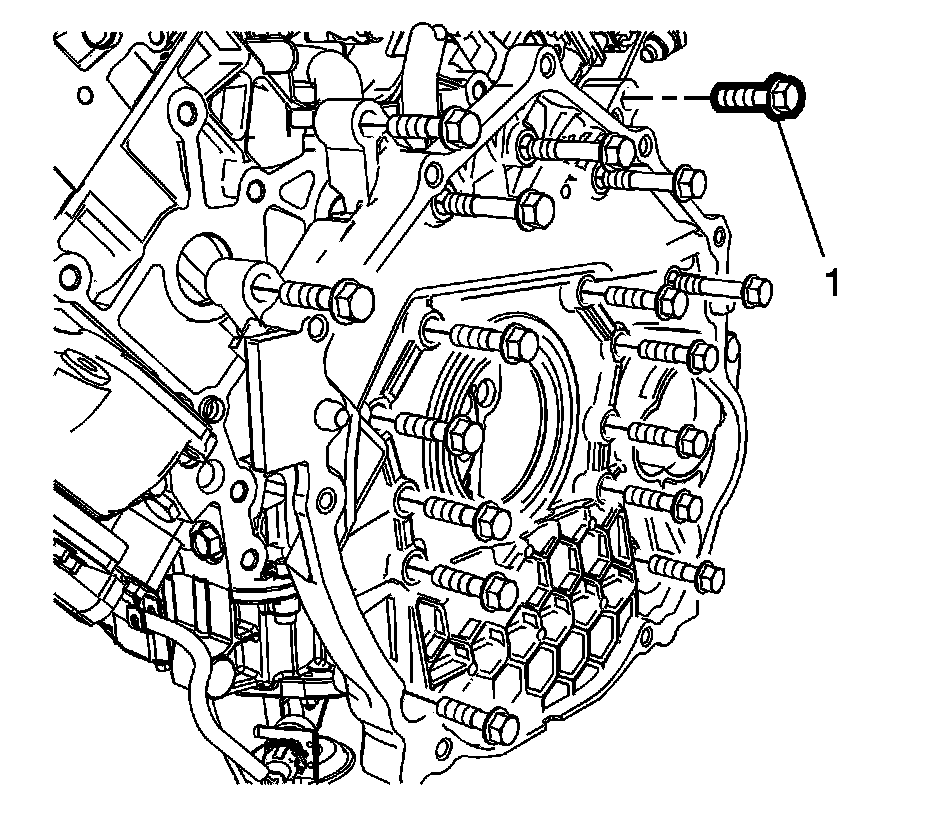 5. Install the flywheel housing bolts (1) and tighten to 95 Nm (70 lb ft).