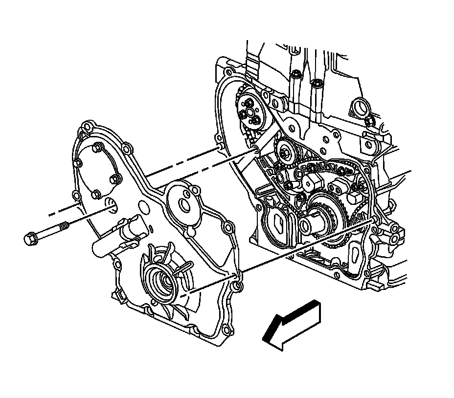 11. Remove the engine front cover to water pump bolt.