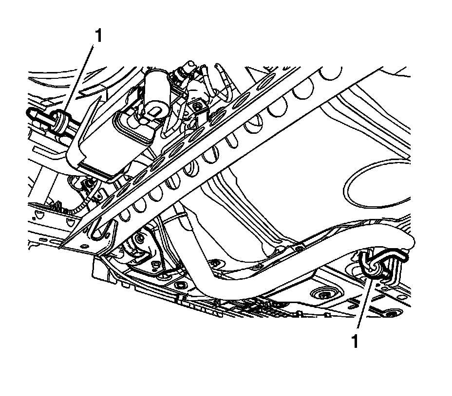 9. Remove the muffler insulators (1) from the underbody hanger and slowly lower the exhaust in order to allow it to rest on the rear axle beam.