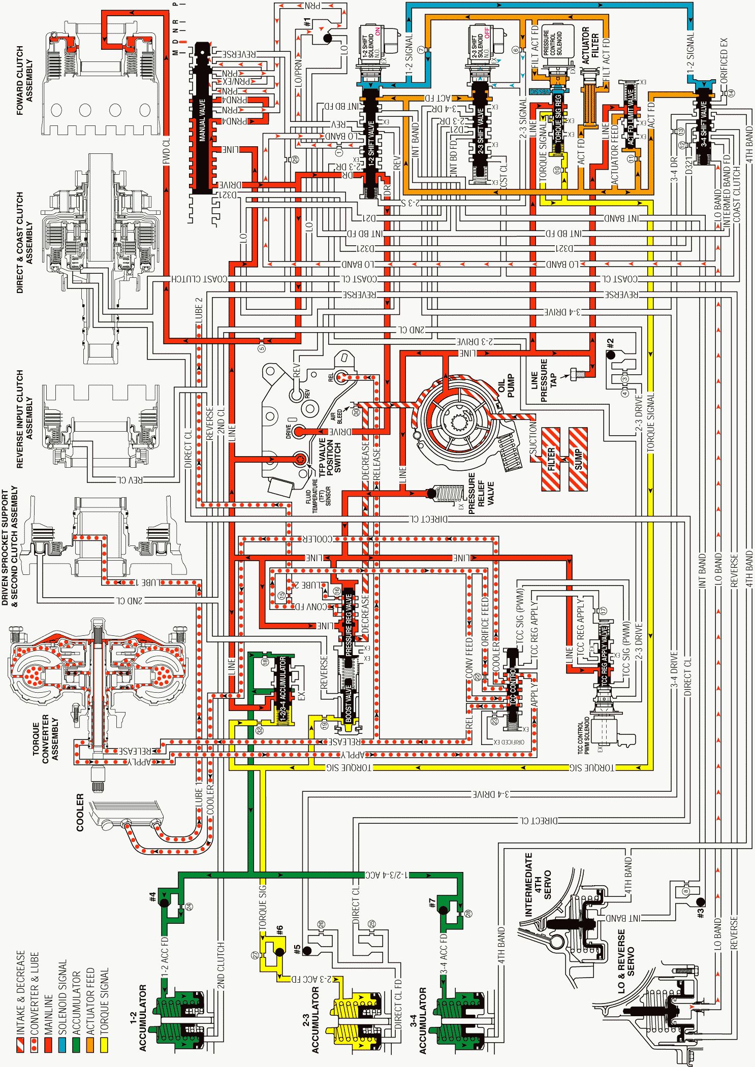 Drive fluid is routed to the TFP Val. Position Sw. Assembly, which signals the PCM that the transmission is in the Overdrive range.