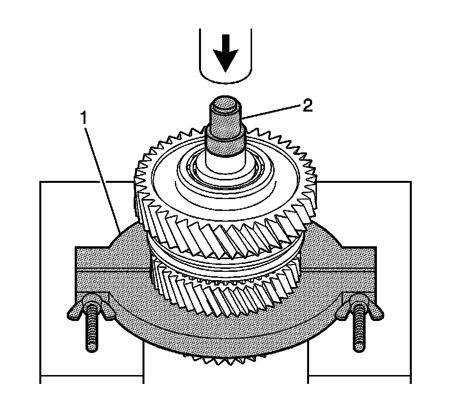 1. Press off the 1st gear assembly and the 2nd gear assembly as a unit, from the intermediate shaft using the J 36513 (1), the J 44383 (2) and a hydraulic press.