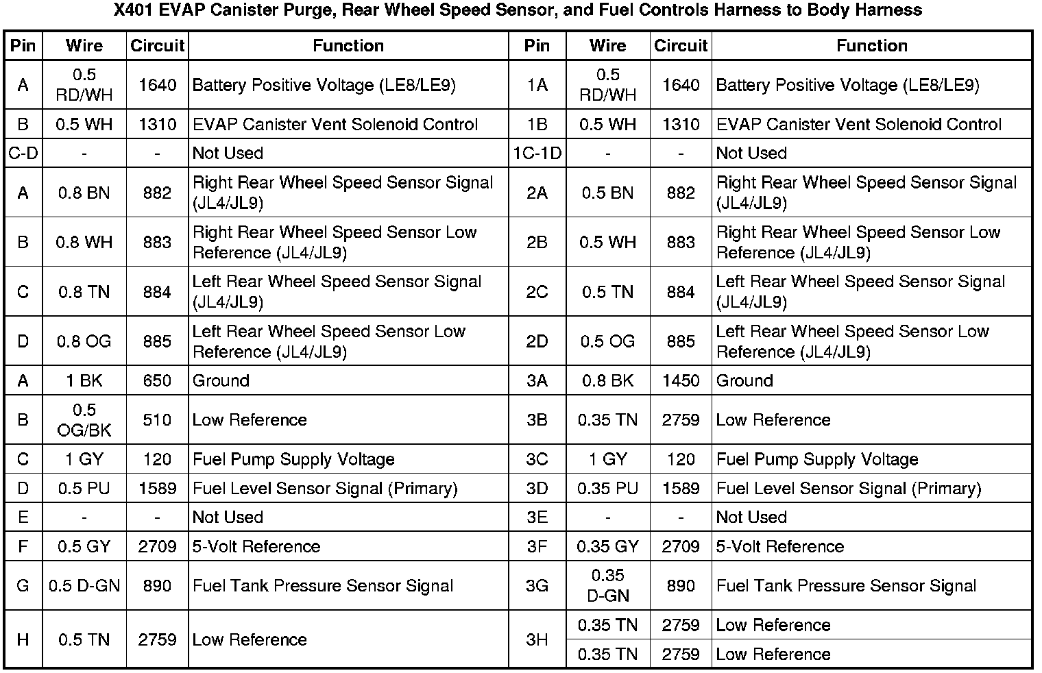 X401 EVAP Canister Purge, Rear Wheel Speed Sensor, and Fuel Controls Harness to Body Harness