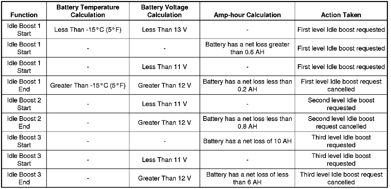 Idle boost is activated in incremental steps, idle boost 1 must be active before idle boost 2 can be active. The criteria used by the body control module (BCM) to regulate electrical power management are outlined below: