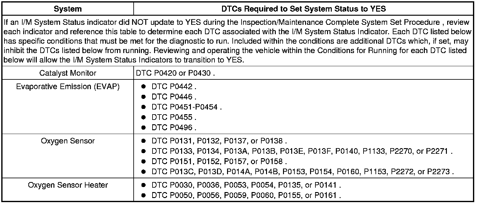 Inspection/Maintenance (I/M) Test DTC Table