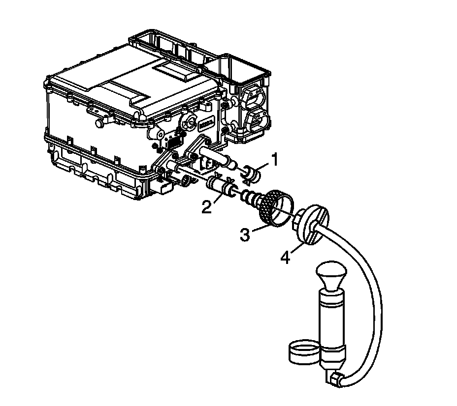 4. Drain the drive motor generator control module assembly of residual coolant by applying 30 psi regulated compressed air to the coolant inlet pipe until no coolant remains.