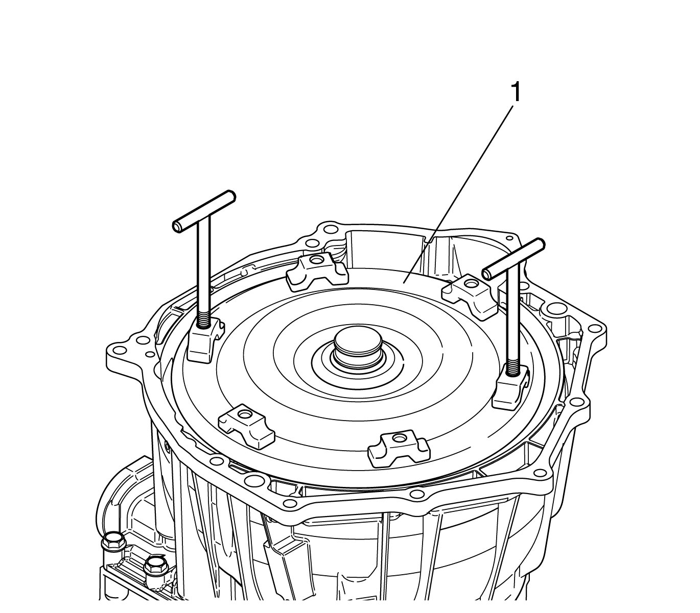 2. Install J 46409 180 degrees apart into 2 lugs on the front of the torque converter.