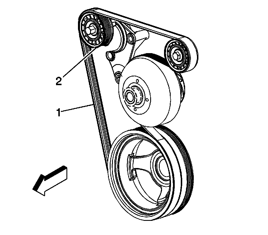 3. Rotate the belt tensioner (2) clockwise in order to relieve the tension on the tensioner.